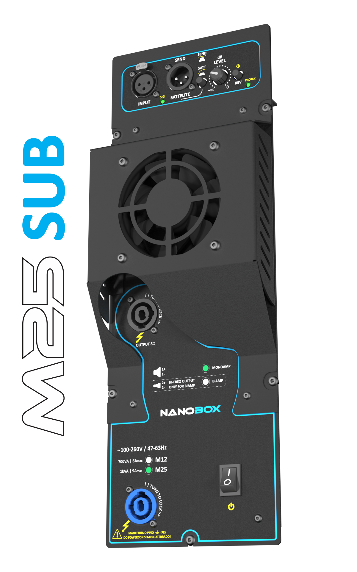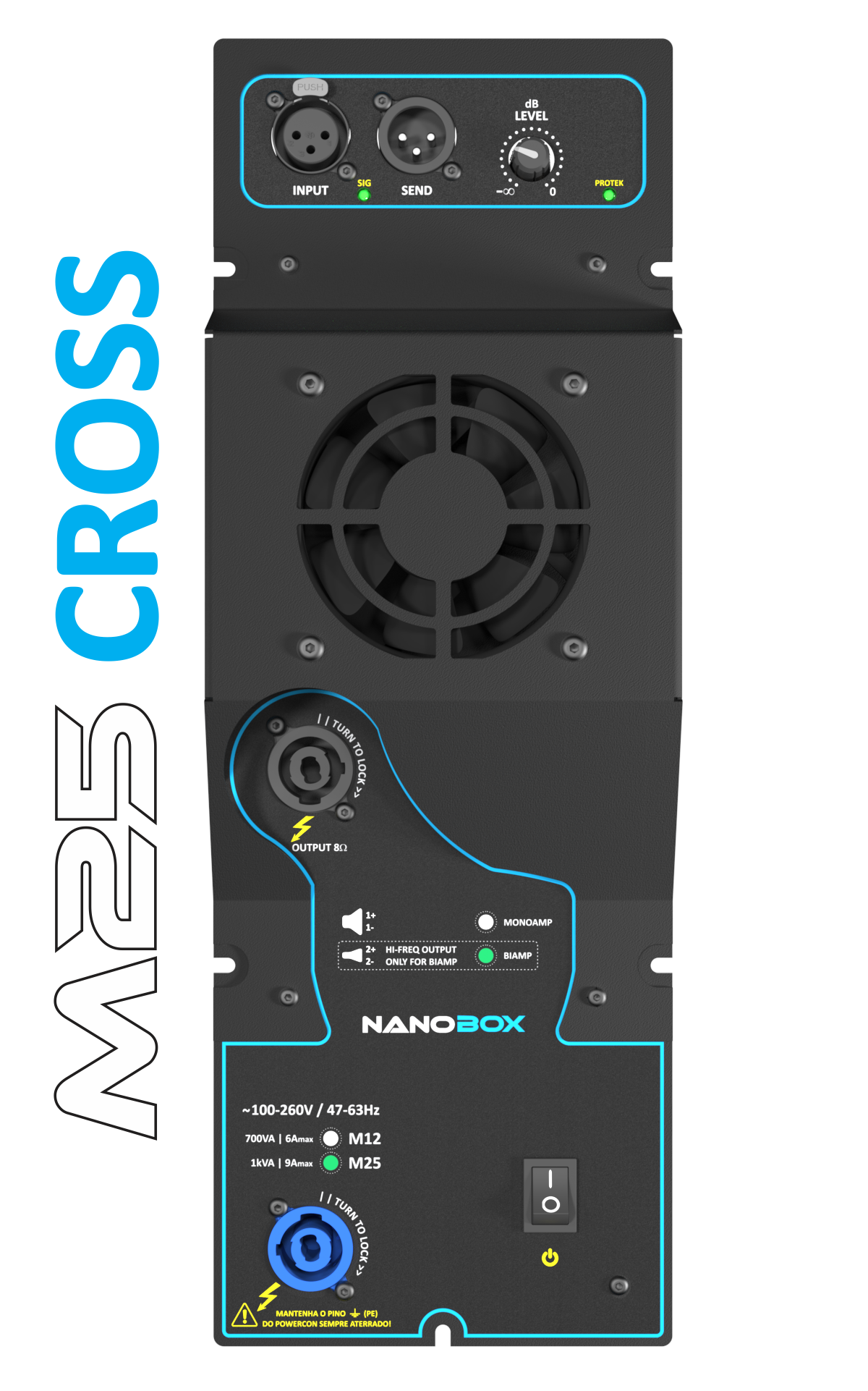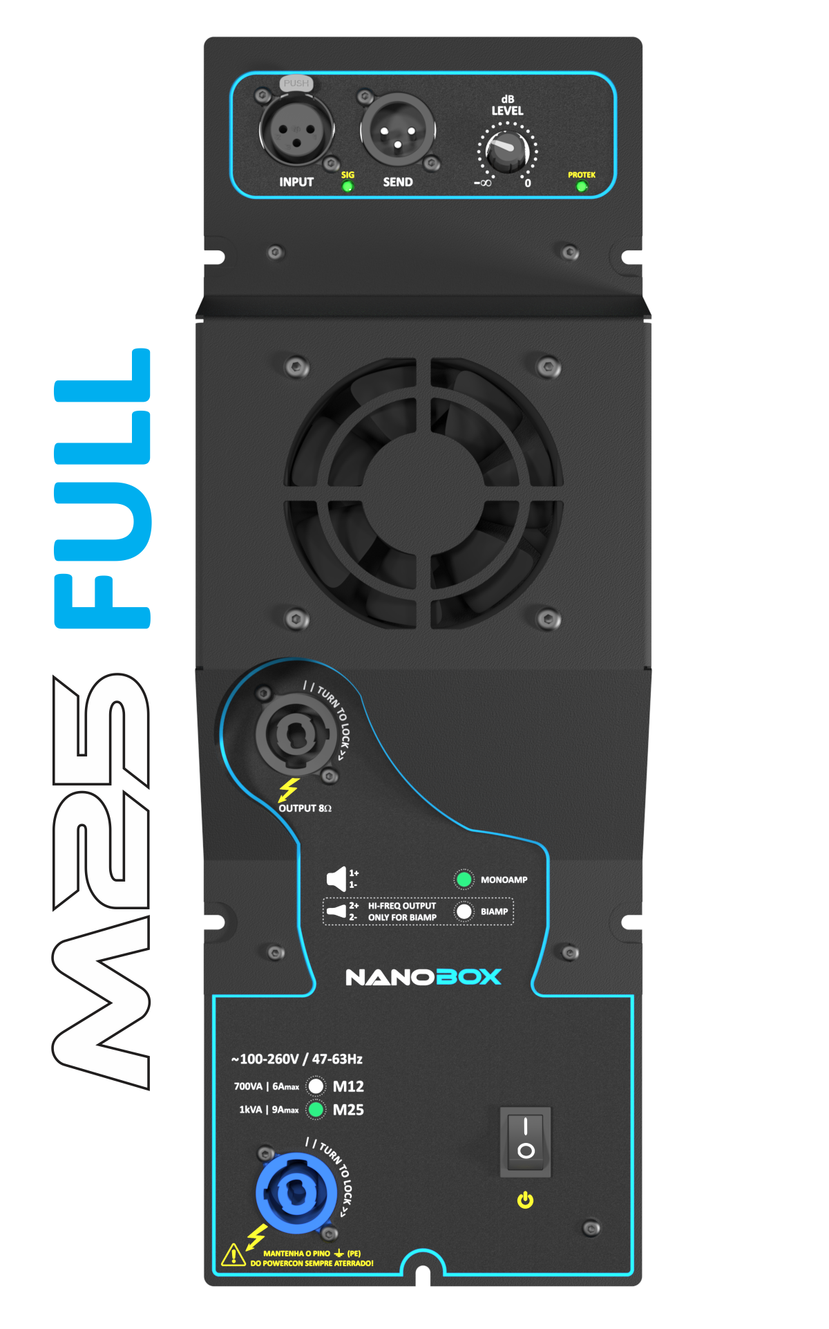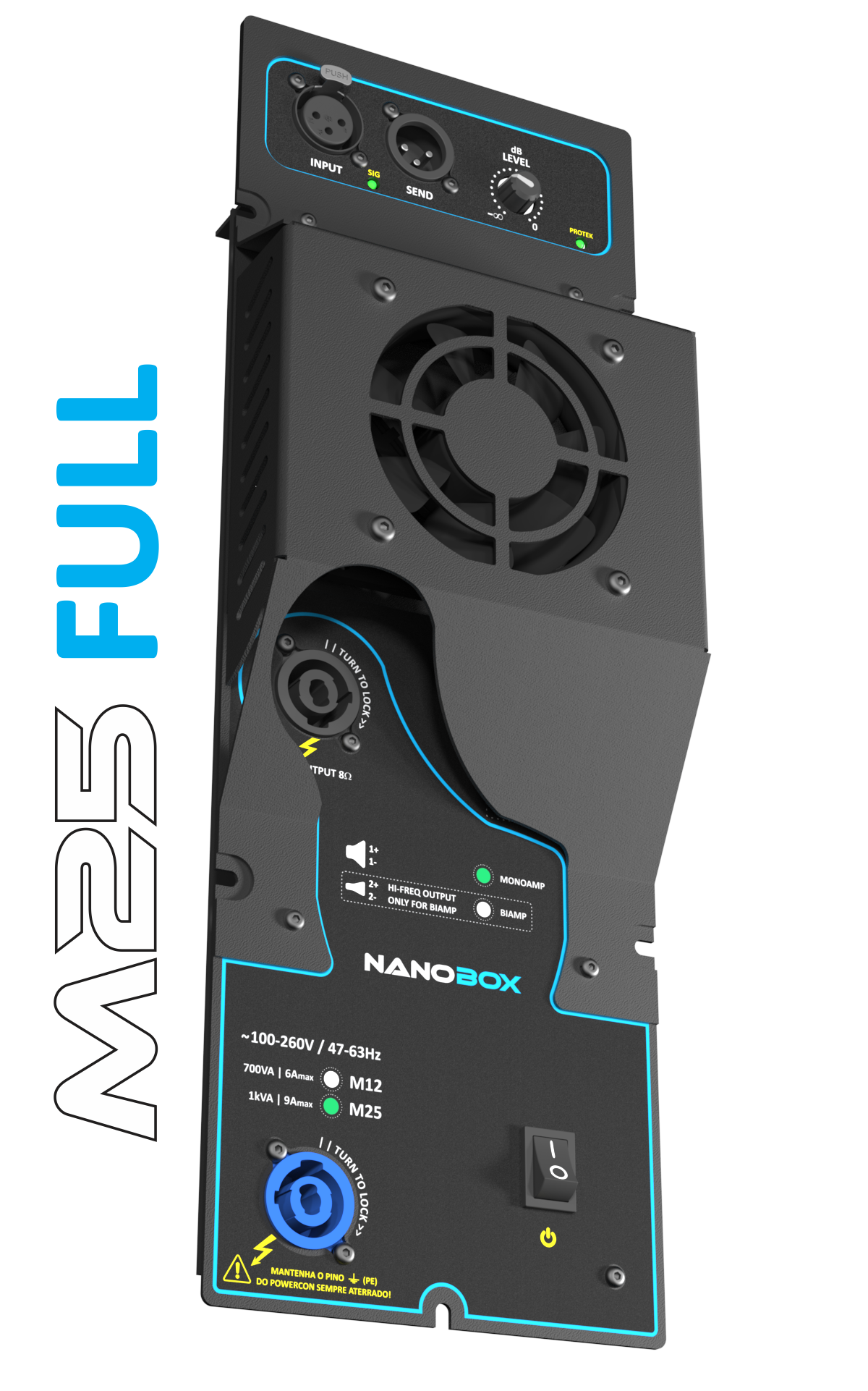 Com potência de 2500W em SUB, até 3000W em FULL & CROSS e pesando apenas 1,9kg, a família M25 é a escolha ideal para ativar caixas de grande porte. O seu inovador projeto mecânico impede a entrada de ar no circuito eletrônico, mantendo-o selado das condições do tempo e graças ao MultiFlex a sua potência pouco difere na faixa de impedâncias 4-8Ω, além de se manter idêntica em qualquer AC entre 100-260V, permanecendo operacional até 90V e, apenas neste caso com redução proporcional de potência. Equipado com PFC, exibe um consumo até 90% menor em corrente AC em relação a produtos similares, além de possibilitar até 60% a mais de potência de saída para um mesmo consumo de energia. Versátil, a família M25 é oferecida em três versões: FULL (monoamp full-range), SUB (monoamp subwoofer) e CROSS (biamp c/ crossover). As versões SUB e CROSS integram crossover Linkwitz-Riley de 24dB/8a e as versões SUB trazem uma chave de seleção para a transferência de sinal, podendo escolher entre SEND (o sinal normal), ou SATTELITE (passa-altas) para complementar de forma perfeita a resposta do SUB com caixas ativas equipadas com versões FULL ou CROSS. A série NanoBOX pode assim formar um completo sistema ativo e processado, sem qualquer equipamento adicional. Combinando amps digitais de última geração e poderosa tecnologia de fontes chaveadas ressonantes com PFC à recursos inéditos como o MultiFlex, a família M25 não possui similar no mercado.