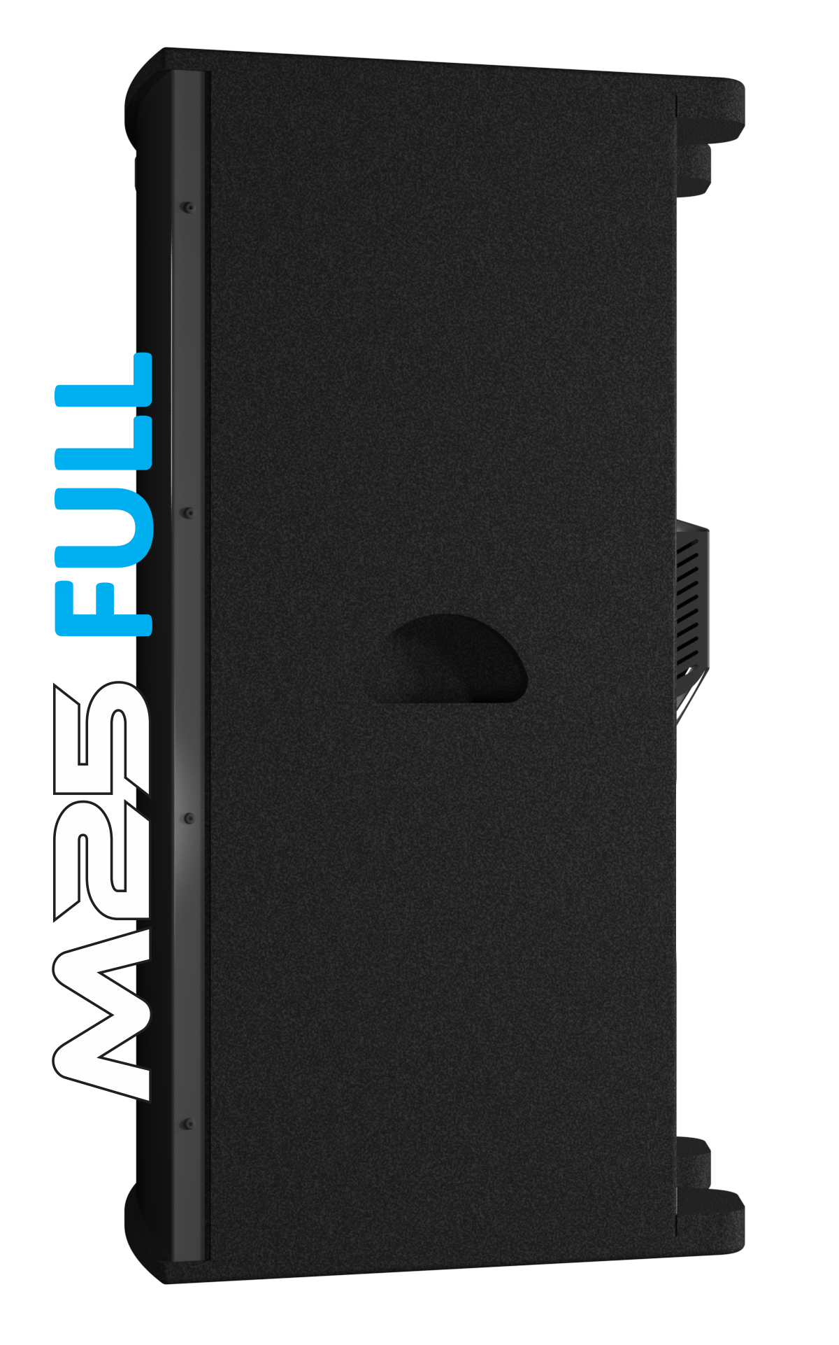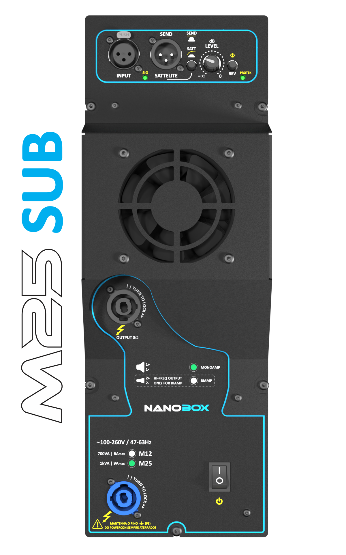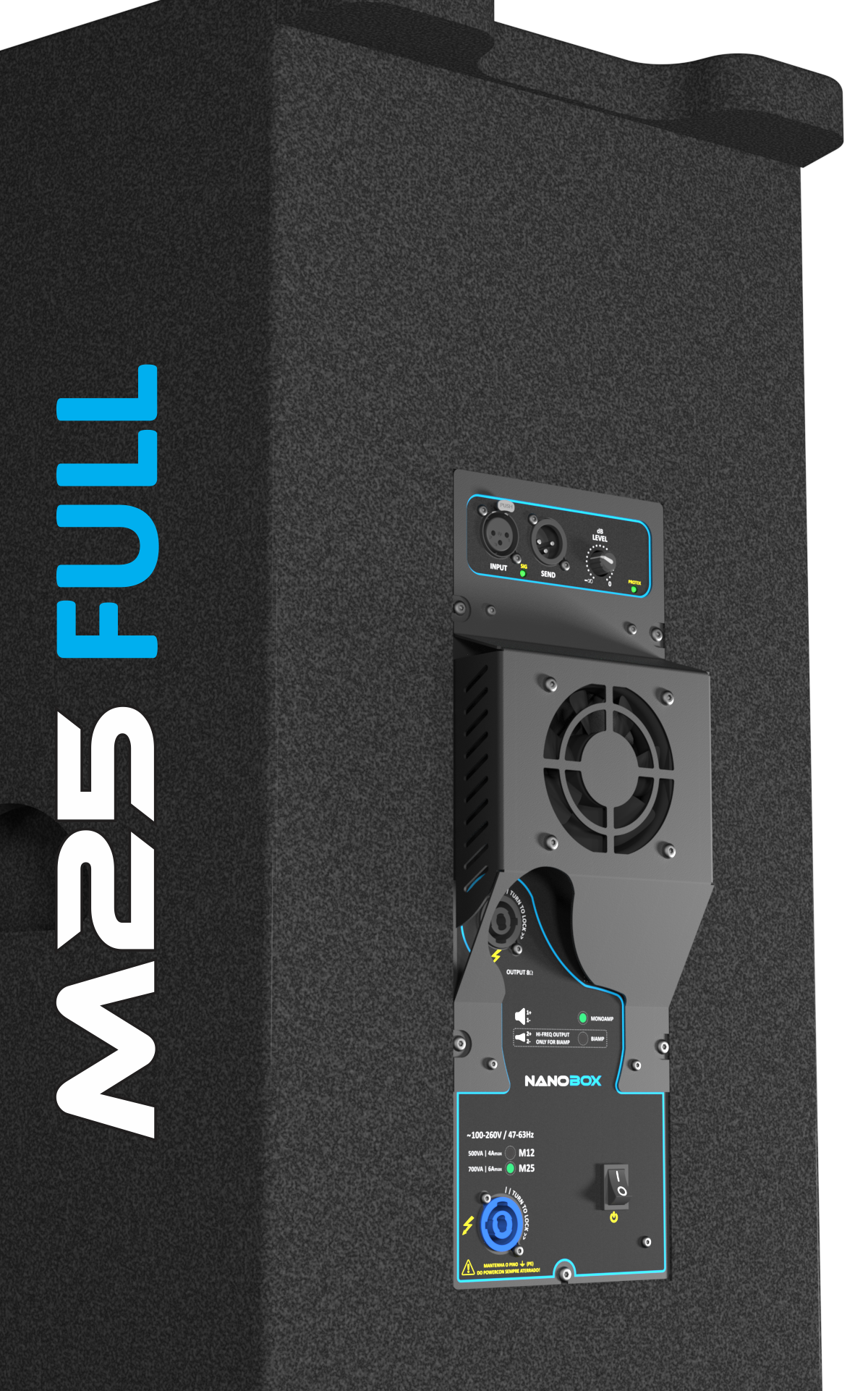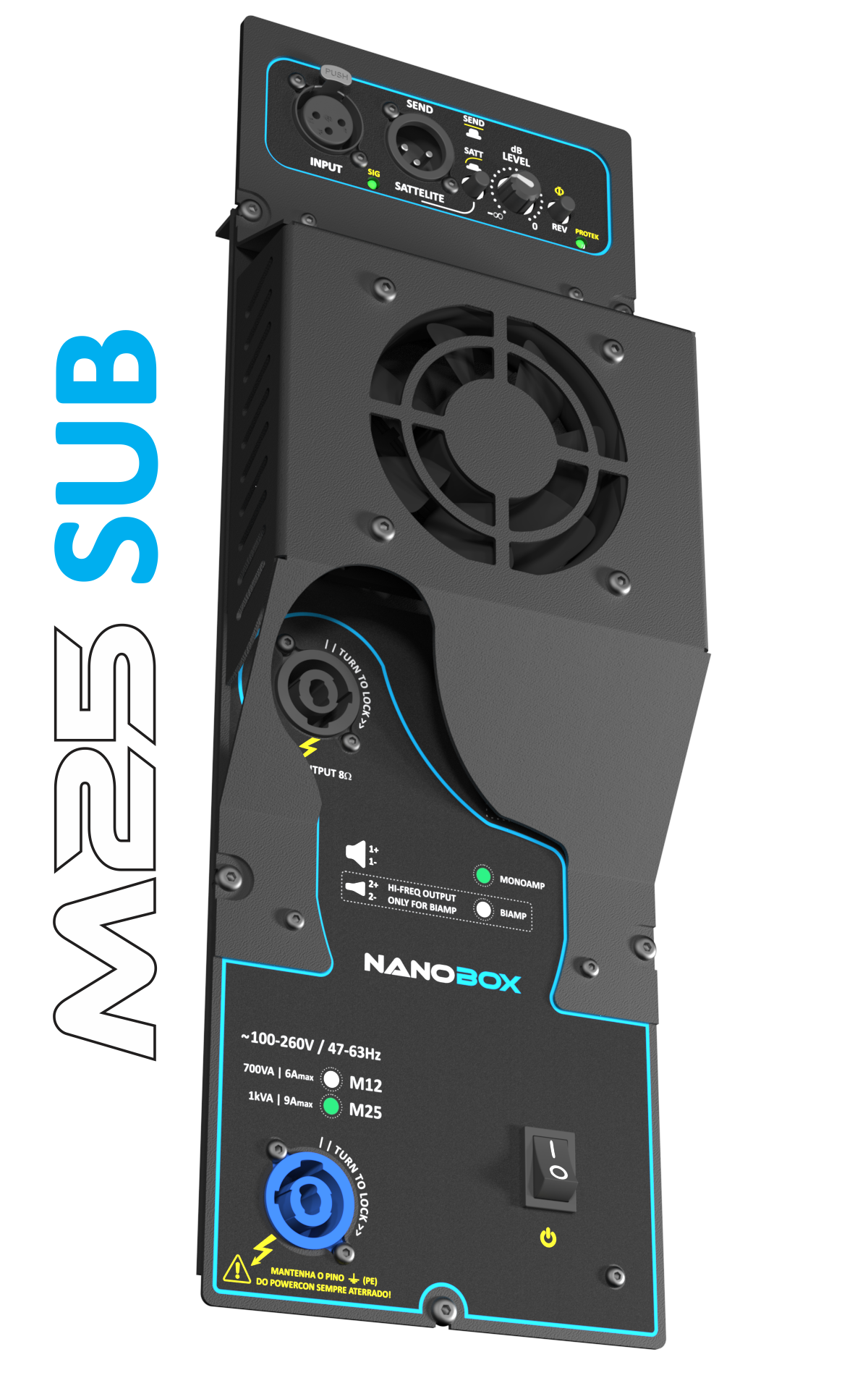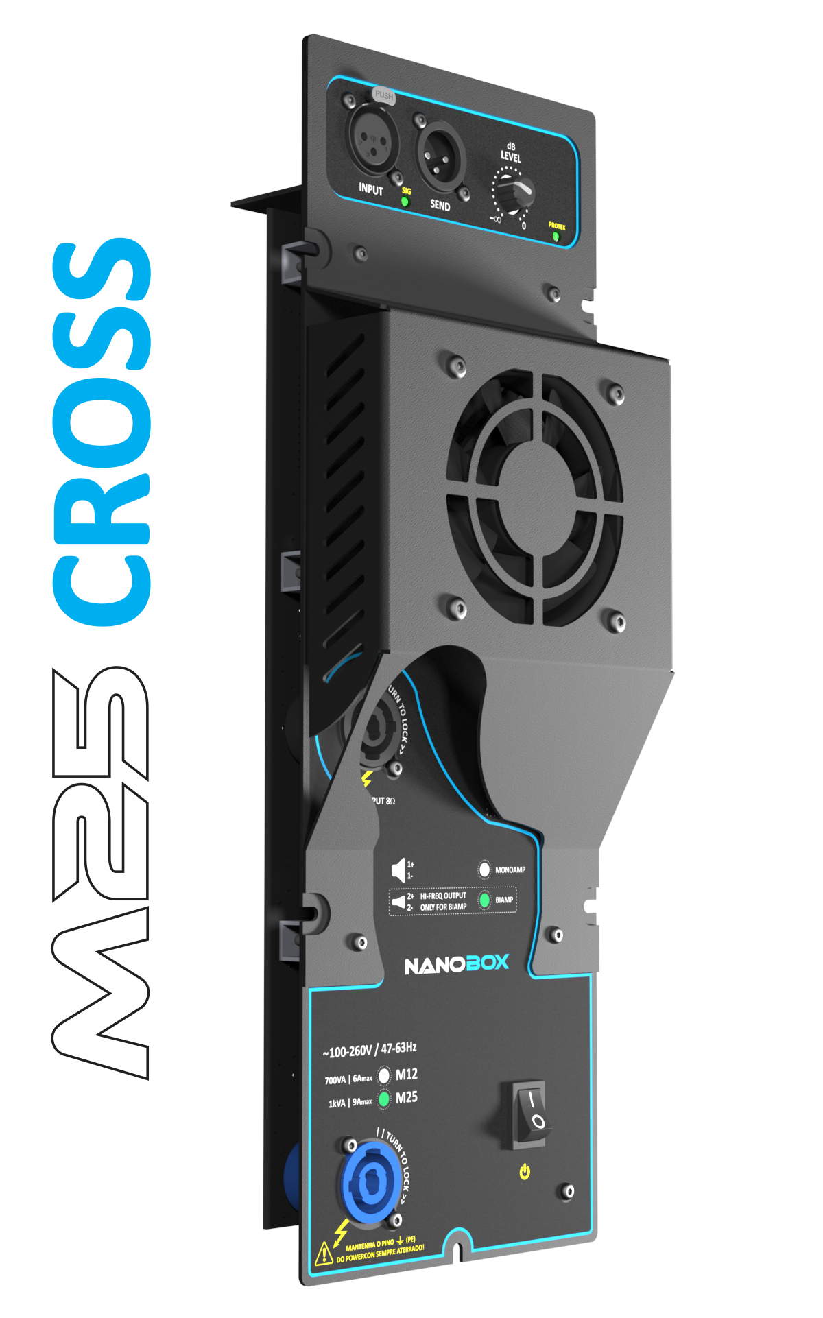 Com potência de 2500W em SUB, até 3000W em FULL & CROSS e pesando apenas 1,9kg, a família M25 é a escolha ideal para ativar caixas de grande porte. O seu inovador projeto mecânico impede a entrada de ar no circuito eletrônico, mantendo-o selado das condições do tempo e graças ao MultiFlex a sua potência pouco difere na faixa de impedâncias 4-8Ω, além de se manter idêntica em qualquer AC entre 100-260V, permanecendo operacional até 90V e, apenas neste caso com redução proporcional de potência. Equipado com PFC, exibe um consumo até 90% menor em corrente AC em relação a produtos similares, além de possibilitar até 60% a mais de potência de saída para um mesmo consumo de energia. Versátil, a família M25 é oferecida em três versões: FULL (monoamp full-range), SUB (monoamp subwoofer) e CROSS (biamp c/ crossover). As versões SUB e CROSS integram crossover Linkwitz-Riley de 24dB/8a e as versões SUB trazem uma chave de seleção para a transferência de sinal, podendo escolher entre SEND (o sinal normal), ou SATTELITE (passa-altas) para complementar de forma perfeita a resposta do SUB com caixas ativas equipadas com versões FULL ou CROSS. A série NanoBOX pode assim formar um completo sistema ativo e processado, sem qualquer equipamento adicional. Combinando amps digitais de última geração e poderosa tecnologia de fontes chaveadas ressonantes com PFC à recursos inéditos como o MultiFlex, a família M25 não possui similar no mercado.