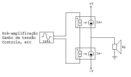 As classes "verdadeiras" ou fundamentais são poucas, somente cinco na verdade (A, B, AB, C e D), sendo que qualquer "outra classe" poderá ser reduzida a uma destas. Neste artigo vamos destacar a topologia tipicamente utilizada em áudio, denominada complementar. Nesta topologia existem dois elementos ativos responsáveis pelo ganho de corrente, Is+ e Is-. Estes elementos podem ser válvulas ou transistores de qualquer tipo. É chamando complementar porque dois dispositivos “empurram” a corrente alternadamente, um em sentido positivo e o outro no sentido negativo, de modo a se complementarem.