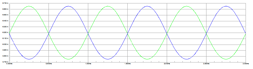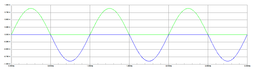 Figura 2 – as correntes em Classe A para um sinal senoidal - em verde Is+ e em azul Is-. Repare que as ondas são senóides completas. Para maior clareza as componentes DC foram removidas e a corrente de Is- foi tomada com a fase invertida