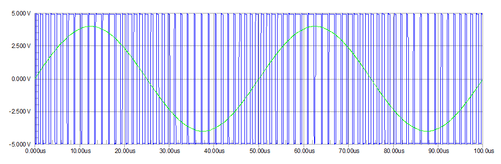 Figura 9 – exemplo de modulação sigma-delta (em azul) para um sinal senoidal de 20kHz (em verde)