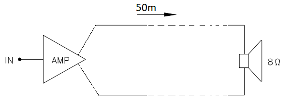 Neste exemplo precisamos levar 10W (PAMP) de som de um amplificador até um alto-falante de 8Ω (ZAF). Mas ele está a 50m de distância do amplificador. Então teremos 100m de condutor (ida + volta), que poderia ser, digamos, um cabo de bitola 1mm2.