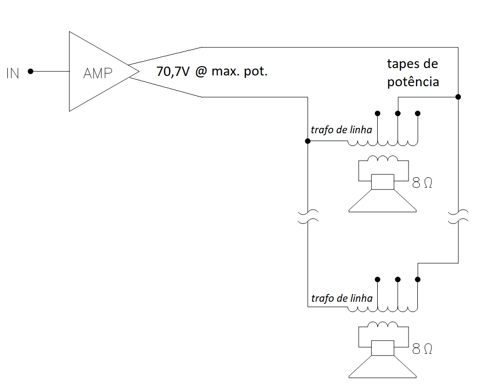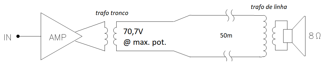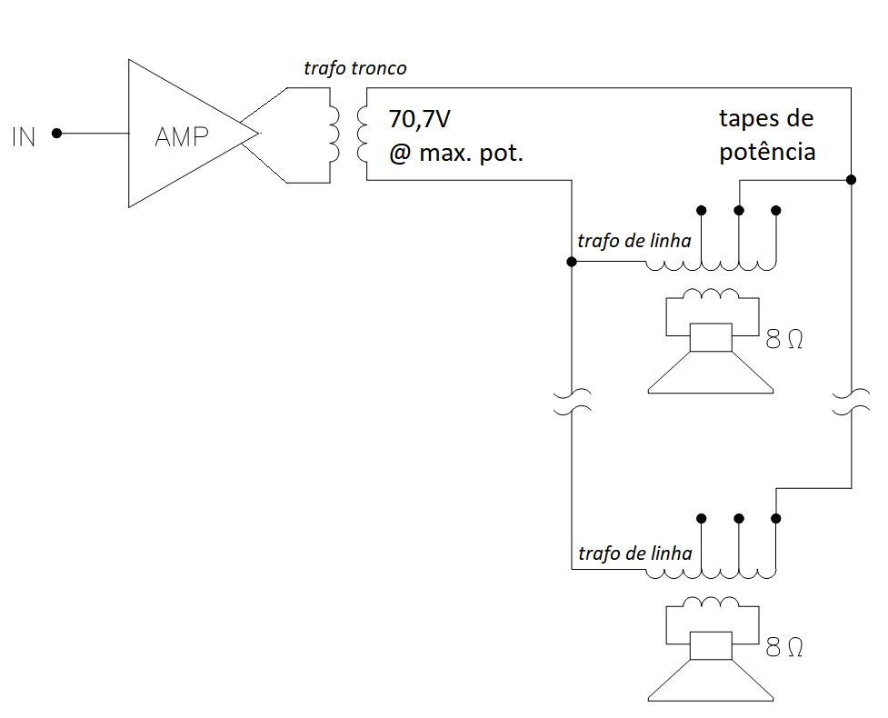 Vamos voltar ao nosso exemplo: se fizéssemos o mesmo serviço, mas agora em “linha de 70,7V”, o esquema ficaria assim: