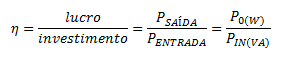 Eficiência (η) é o lucro dividido pelo investimento. É mais simples do que parece - simplesmente o quociente do que saiu pelo que entrou; desta forma: