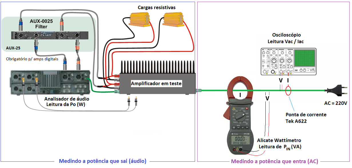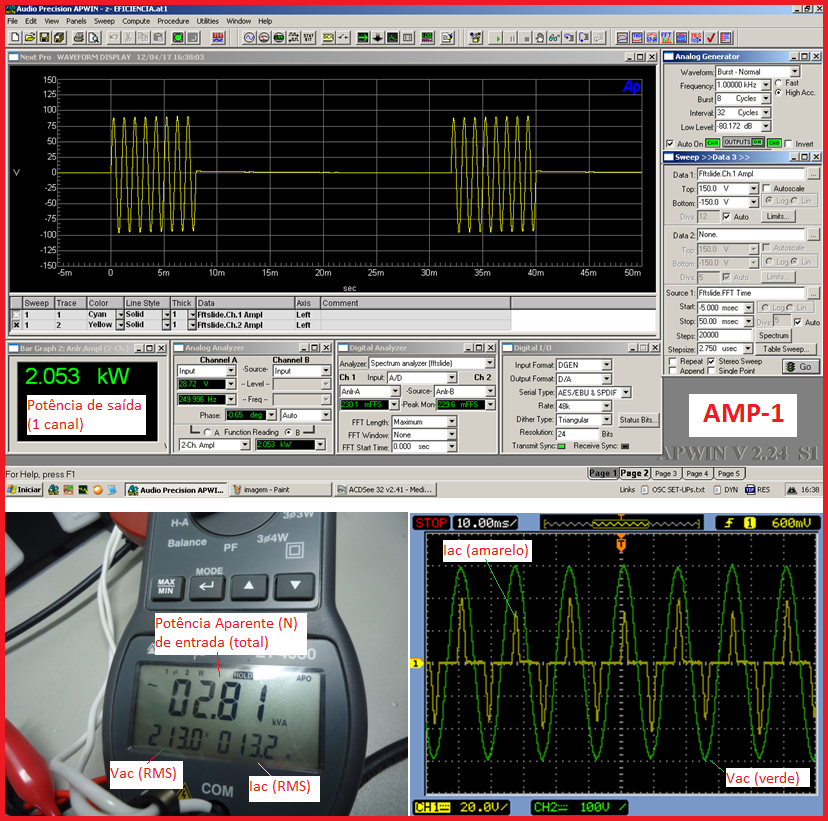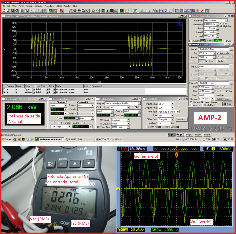 Ao fazer isso, anotaremos a potência exata de saída (W) de cada um deles, ao mesmo tempo em que tomamos nota da potência aparente (VA) que está sendo drenada da rede AC pelo respectivo amplificador. E aproveitaremos esse momento para "samplear" no osciloscópio as ondas de tensão e de corrente AC drenadas da rede elétrica.