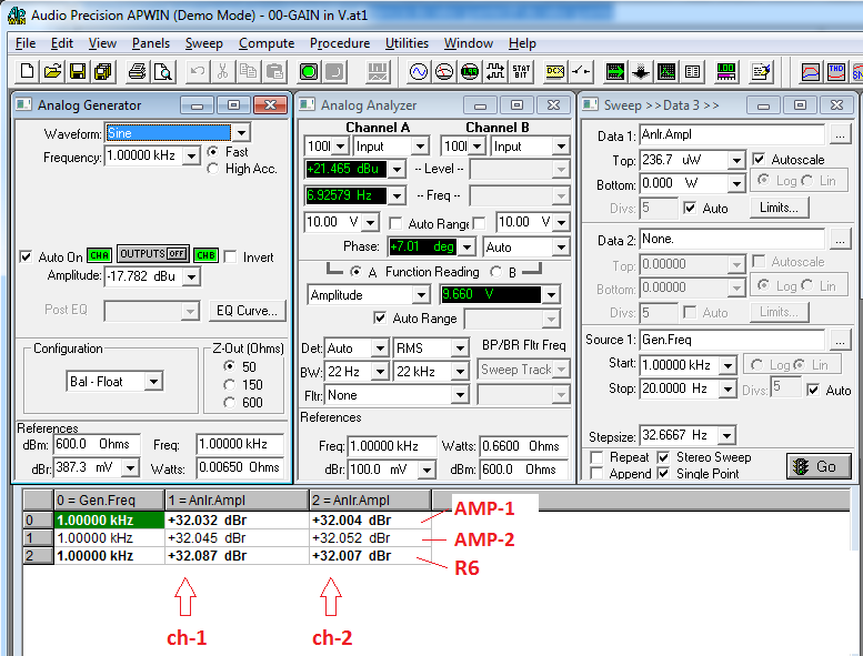 Repetindo de forma idêntica este procedimento, em sequência para os três amplificadores, primeiro para o AMP-1, obtemos:
