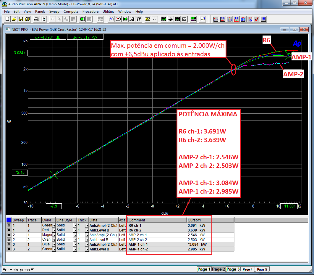 Rapidamente, pelo gráfico identificamos que a máxima potência em comum para esses três amplificadores ocorre quando aplicamos +6,5dBu em suas entradas, gerando uma potência de 2.000W/canal (@ 2Ω), ou 4.000W no total - encontramos então o ponto de equilíbrio "por baixo" perfeito entre eles - e razoavelmente próximo de suas respectivas potências máximas.