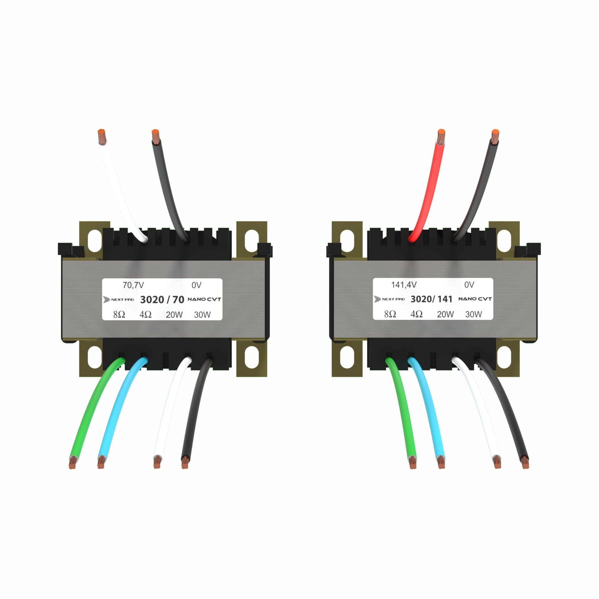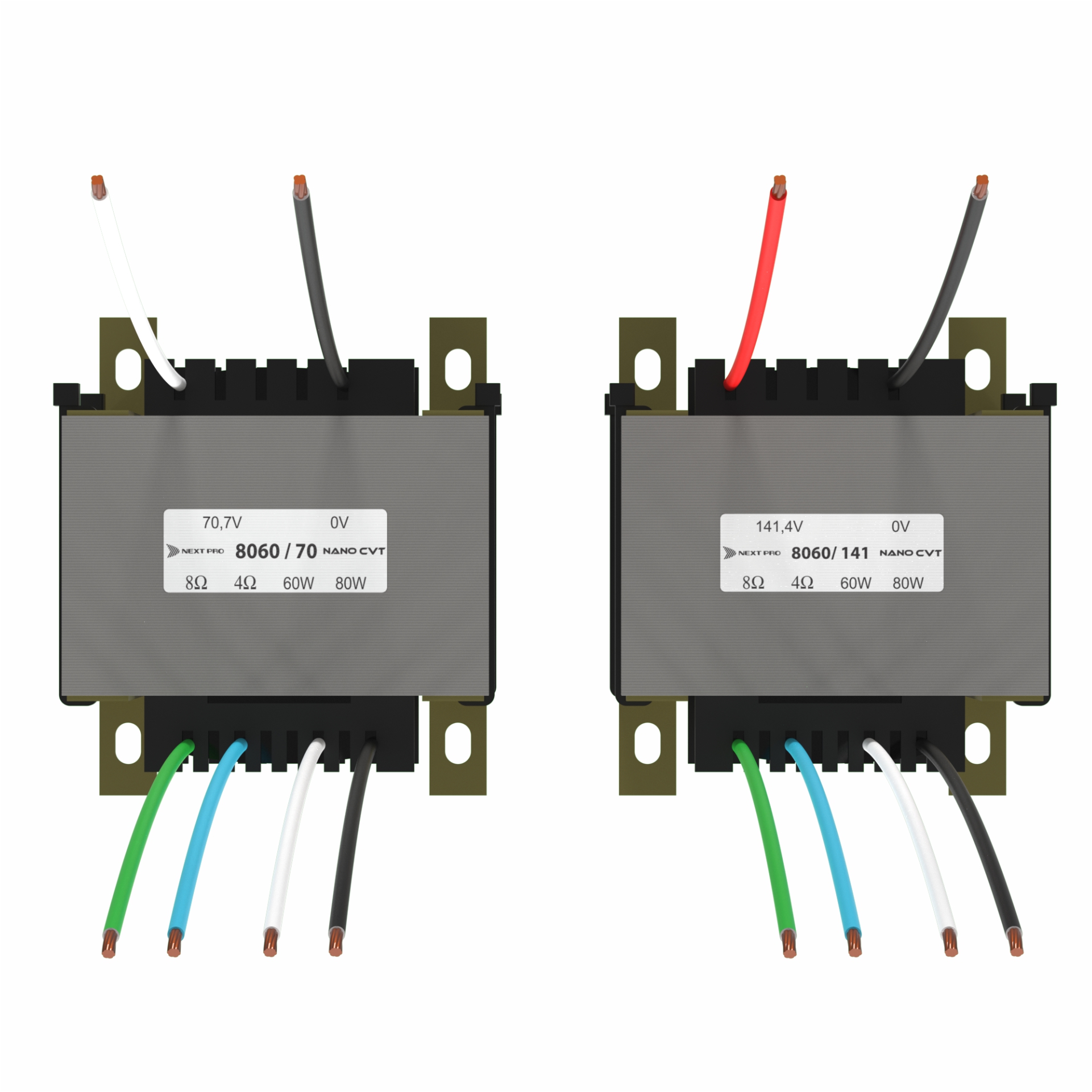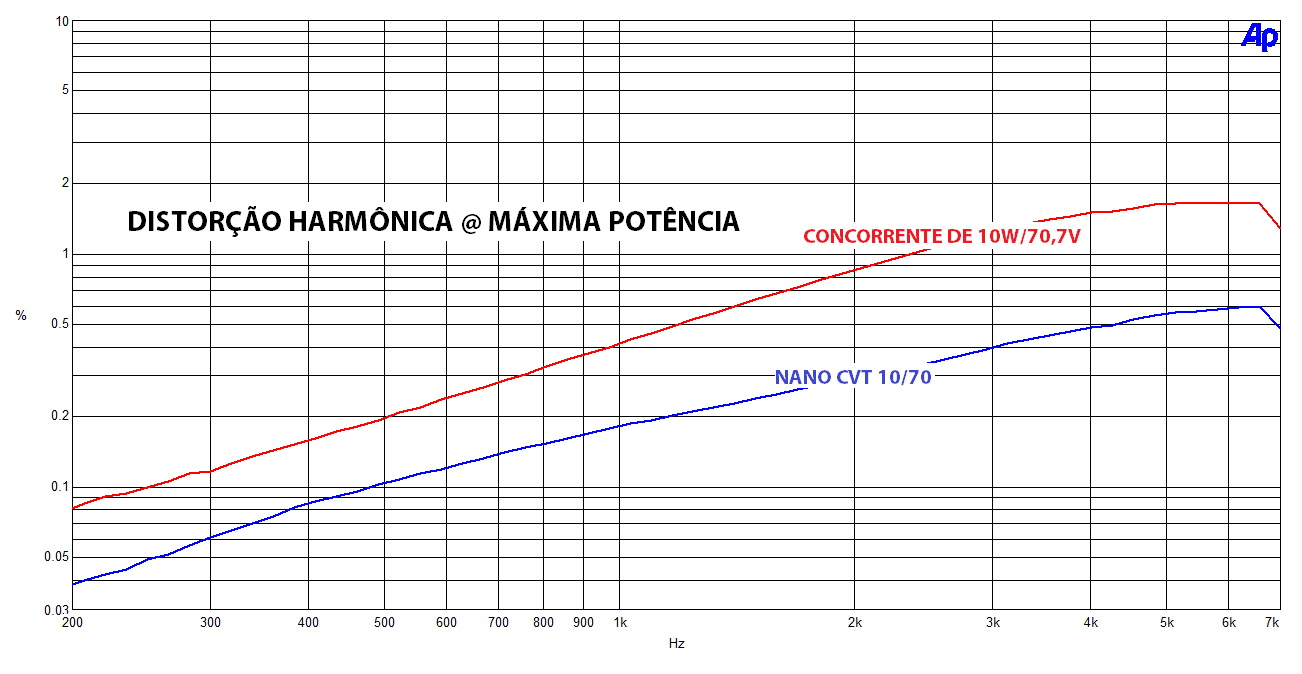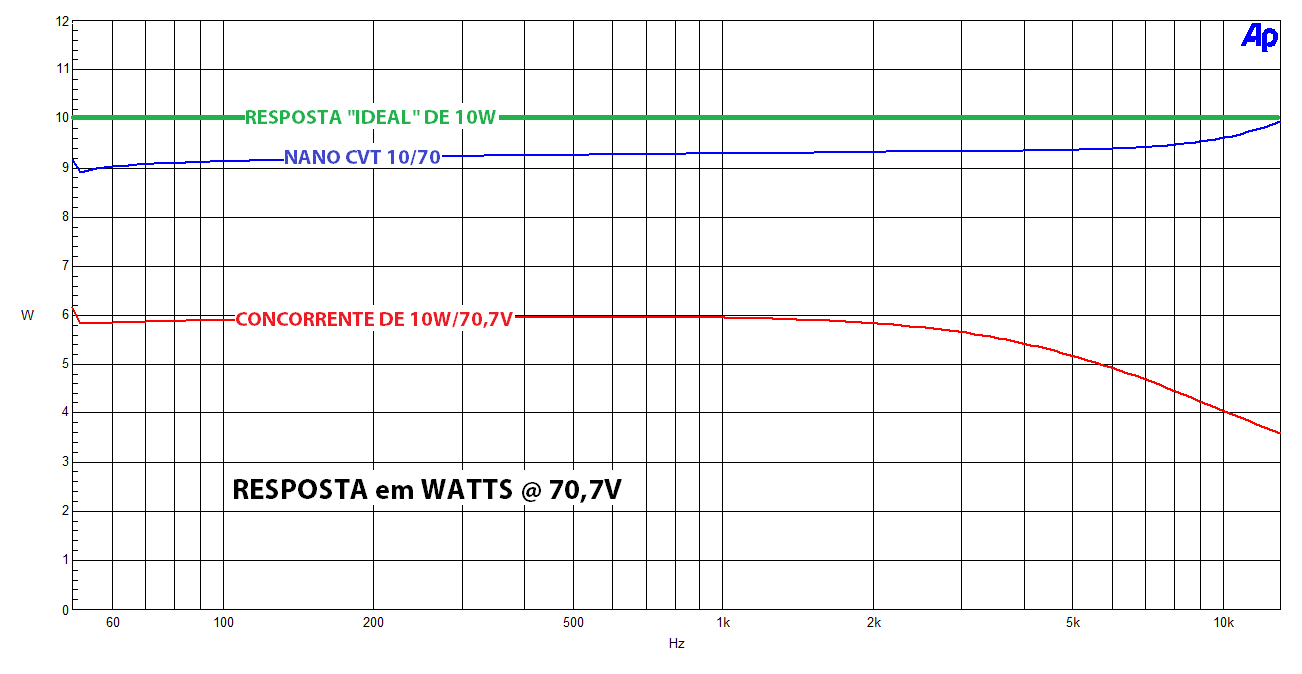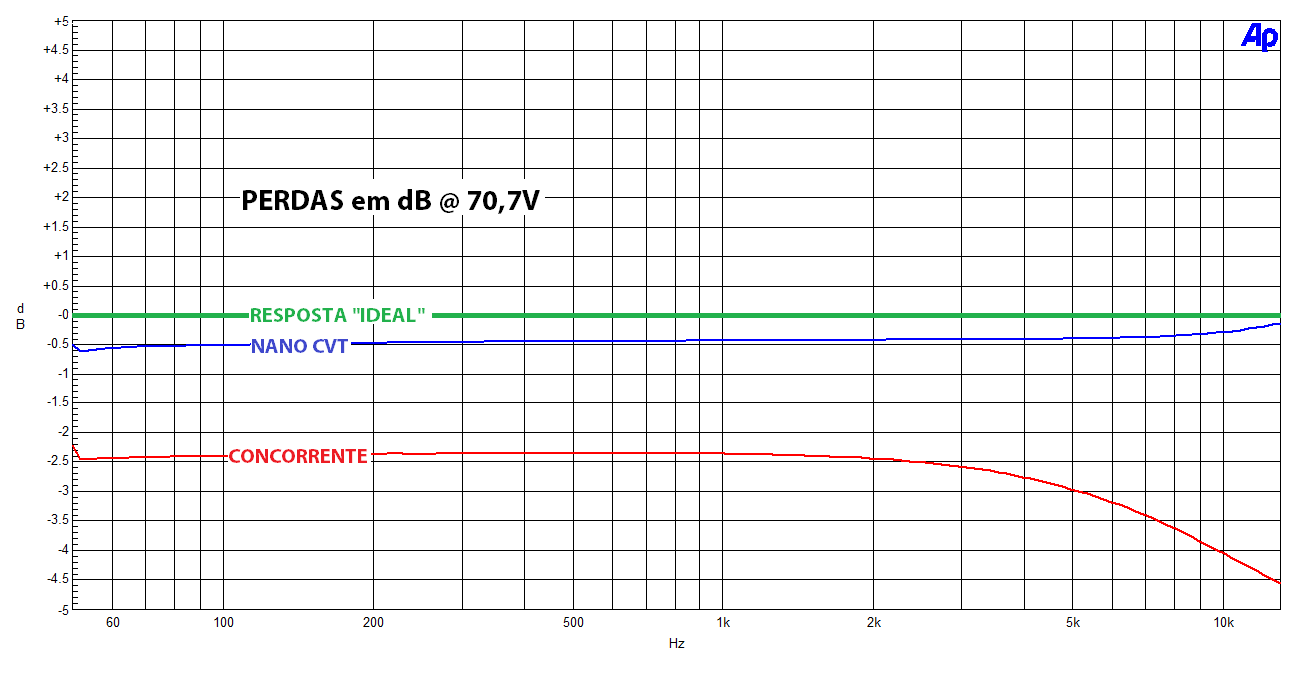 Com modelos de 10 à 80W e para linhas de 70,7 e 141,4V, os transformadores da Série NanoCVT representam uma grande evolução para as instalações em linha. Projetados através de modelagem matemática estrutural, possuem rendimentos muito superiores à de produtos consagrados do mercado, que tipicamente apresentam perdas de 2,5dB ou mais (40% ou mais de potência perdida). Enquanto que os NanoCVT perdem, no pior caso, 0,4dB (7%) chegando a apenas 0,04dB no modelo de 80W (apenas 1% de potência perdida). Além disso, a resposta em frequências e a distorção harmônica são muito melhores, especialmente nas médias-altas, onde produtos renomados perdem ainda mais, resultando em volume baixo, som abafado e distorcido. Veja abaixo um comparativo do NanoCVT com um produto similar de marca consagrada:
