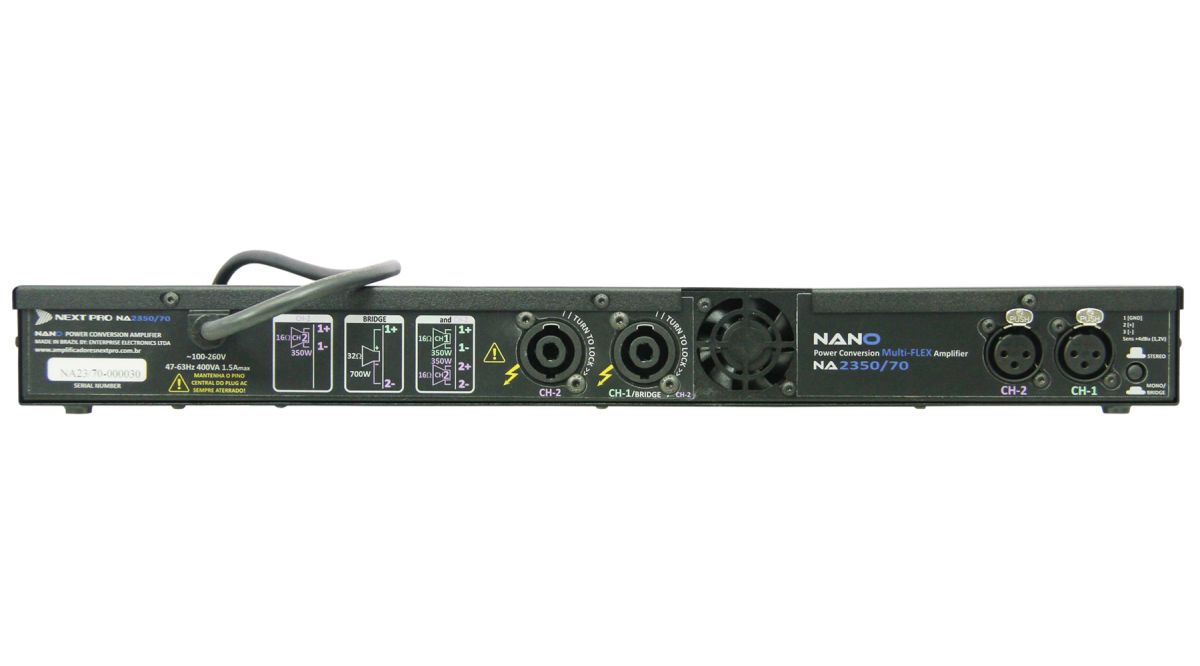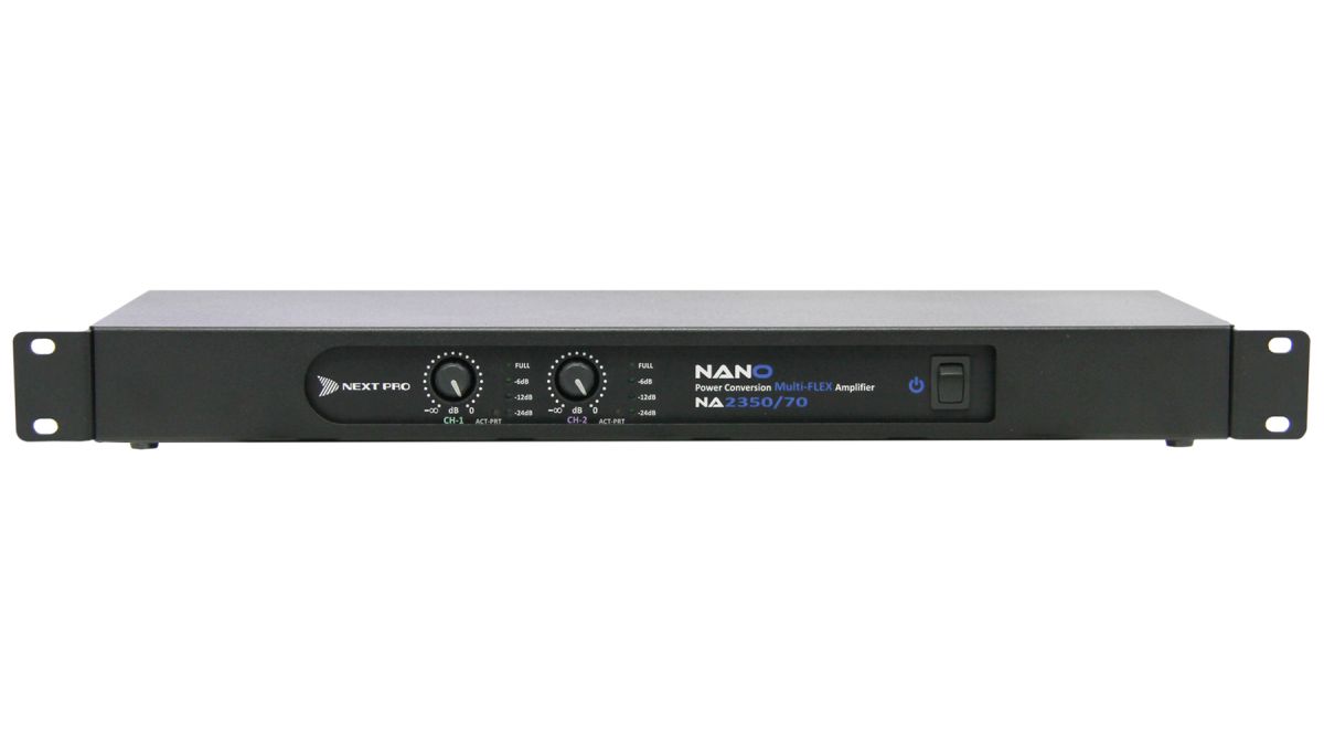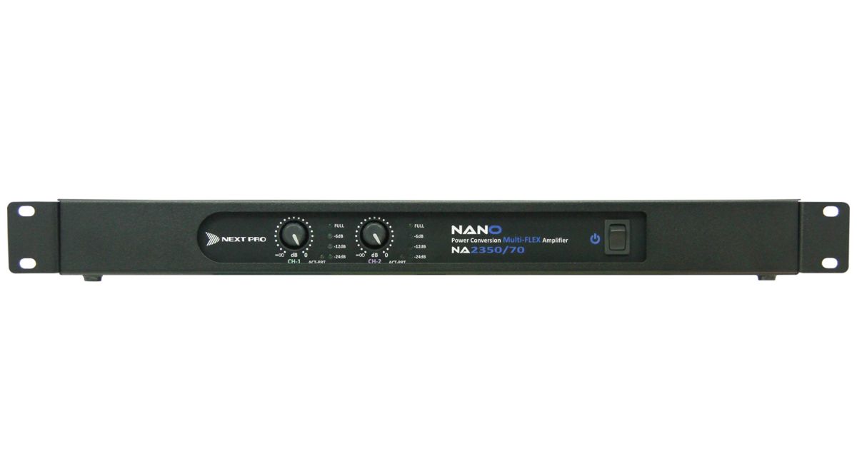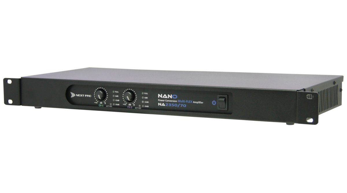 Com potência de 2x 300W em linha de 70,7V e 1x 600W em linha de 141V, 1U de rack e pesando apenas 2,6kg, o NA 2350/70 é ideal para instalações com cabeamento de longa distância. Sua potência total se mantém com qualquer AC entre 100-260V, podendo cair até incríveis 65Vac, e apenas neste caso haverá redução (proporcional) de potência! Devido as suas dimensões e peso extremamente reduzidos o NA 2350/70 proporciona uma instalação drasticamente mais compacta e leve que as obtidas por amps analógicos convencionais.