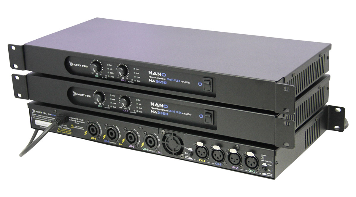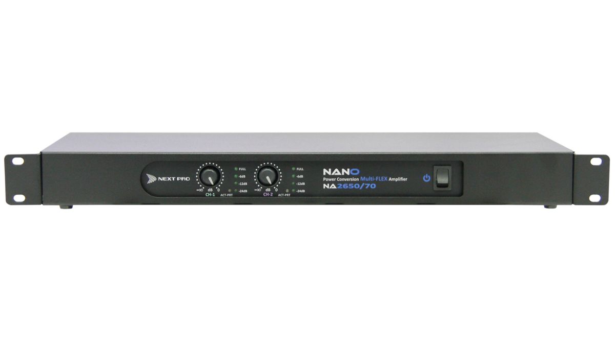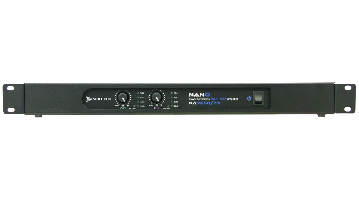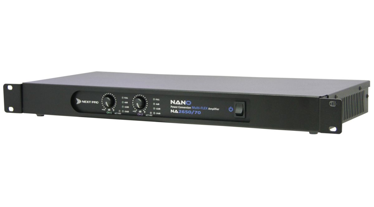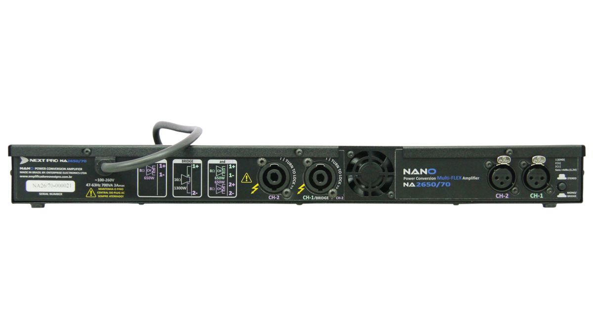 Com potência de 2x 600W em linha de 70,7V e 1x 1200W em linha de 141V, 1U de rack e pesando apenas 2,9kg, o NA 2650/70 é ideal para grandes instalações com cabeamento de longa distância. Sua potência total se mantém com qualquer AC entre 100-260V, podendo cair até incríveis 65Vac, e apenas neste caso haverá redução (proporcional) de potência! Devido as suas dimensões e peso extremamente reduzidos o NA 2650/70 proporciona uma instalação drasticamente mais compacta e leve que as obtidas por amps analógicos convencionais.