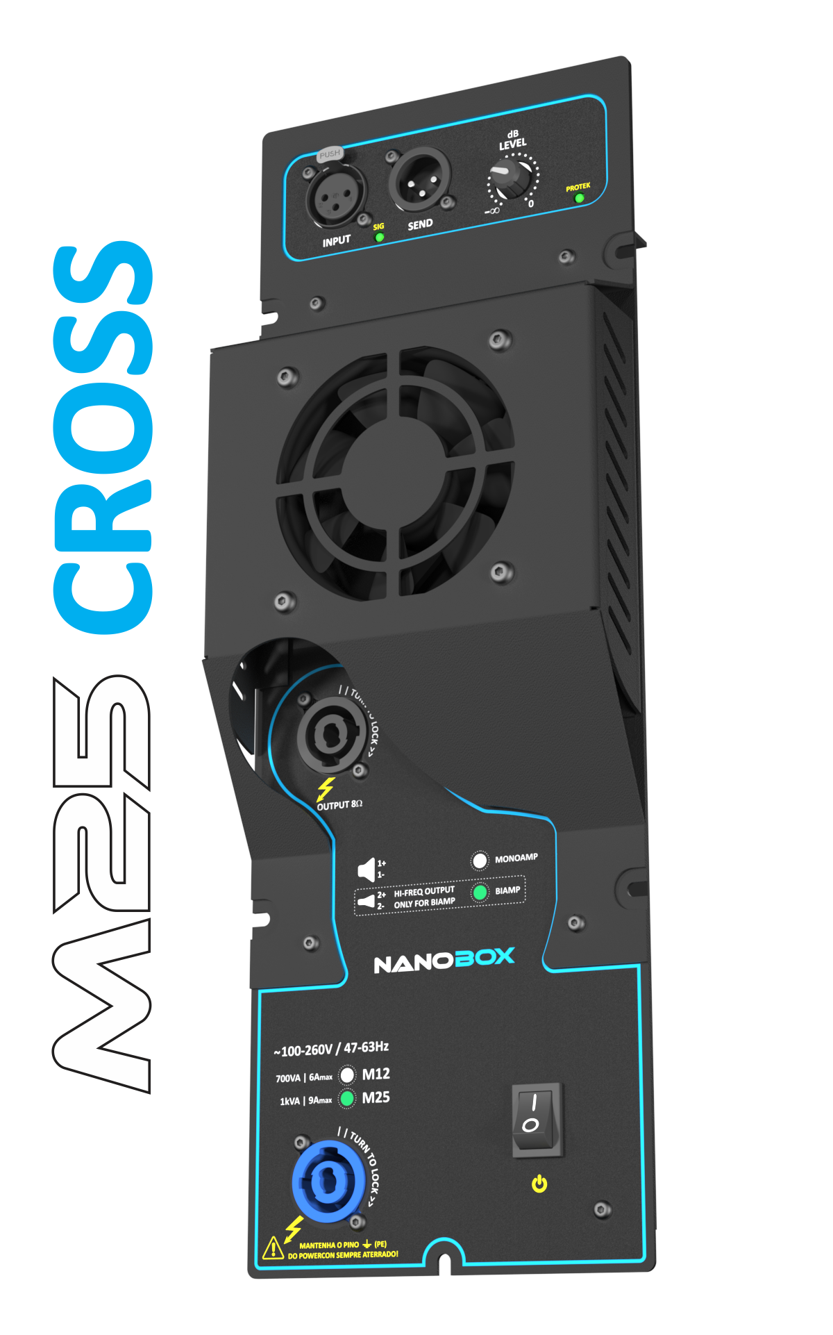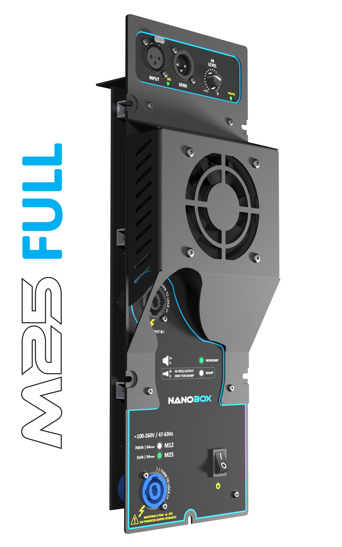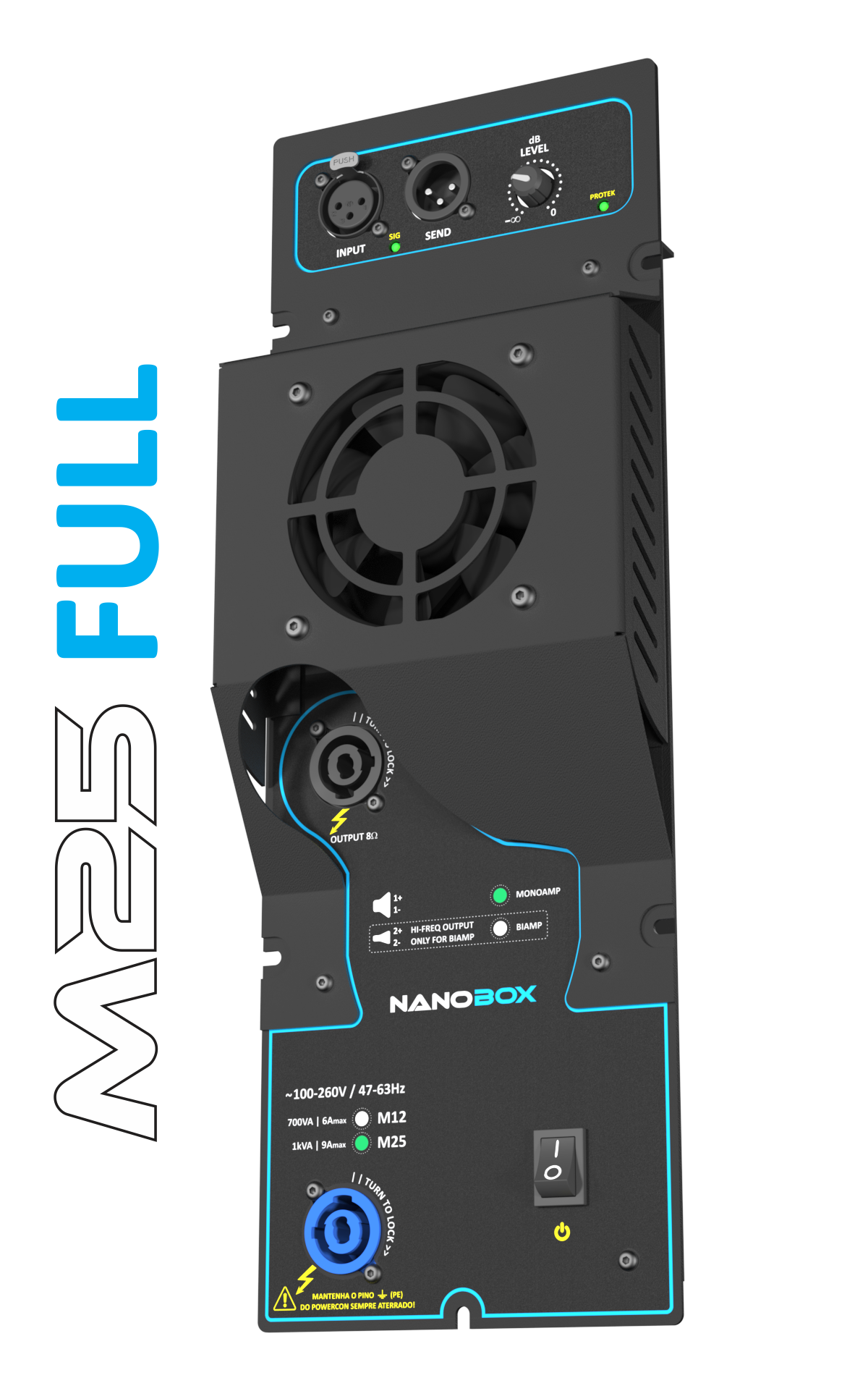 Com potência de 2500W em SUB, até 3000W em FULL & CROSS e pesando apenas 1,9kg, a família M25 é a escolha ideal para ativar caixas de grande porte. O seu inovador projeto mecânico impede a entrada de ar no circuito eletrônico, mantendo-o selado das condições do tempo e graças ao MultiFlex a sua potência pouco difere na faixa de impedâncias 4-8Ω, além de se manter idêntica em qualquer AC entre 100-260V, permanecendo operacional até 90V e, apenas neste caso com redução proporcional de potência. Equipado com PFC, exibe um consumo até 90% menor em corrente AC em relação a produtos similares, além de possibilitar até 60% a mais de potência de saída para um mesmo consumo de energia. Versátil, a família M25 é oferecida em três versões: FULL (monoamp full-range), SUB (monoamp subwoofer) e CROSS (biamp c/ crossover). As versões SUB e CROSS integram crossover Linkwitz-Riley de 24dB/8a e as versões SUB trazem uma chave de seleção para a transferência de sinal, podendo escolher entre SEND (o sinal normal), ou SATTELITE (passa-altas) para complementar de forma perfeita a resposta do SUB com caixas ativas equipadas com versões FULL ou CROSS. A série NanoBOX pode assim formar um completo sistema ativo e processado, sem qualquer equipamento adicional. Combinando amps digitais de última geração e poderosa tecnologia de fontes chaveadas ressonantes com PFC à recursos inéditos como o MultiFlex, a família M25 não possui similar no mercado.