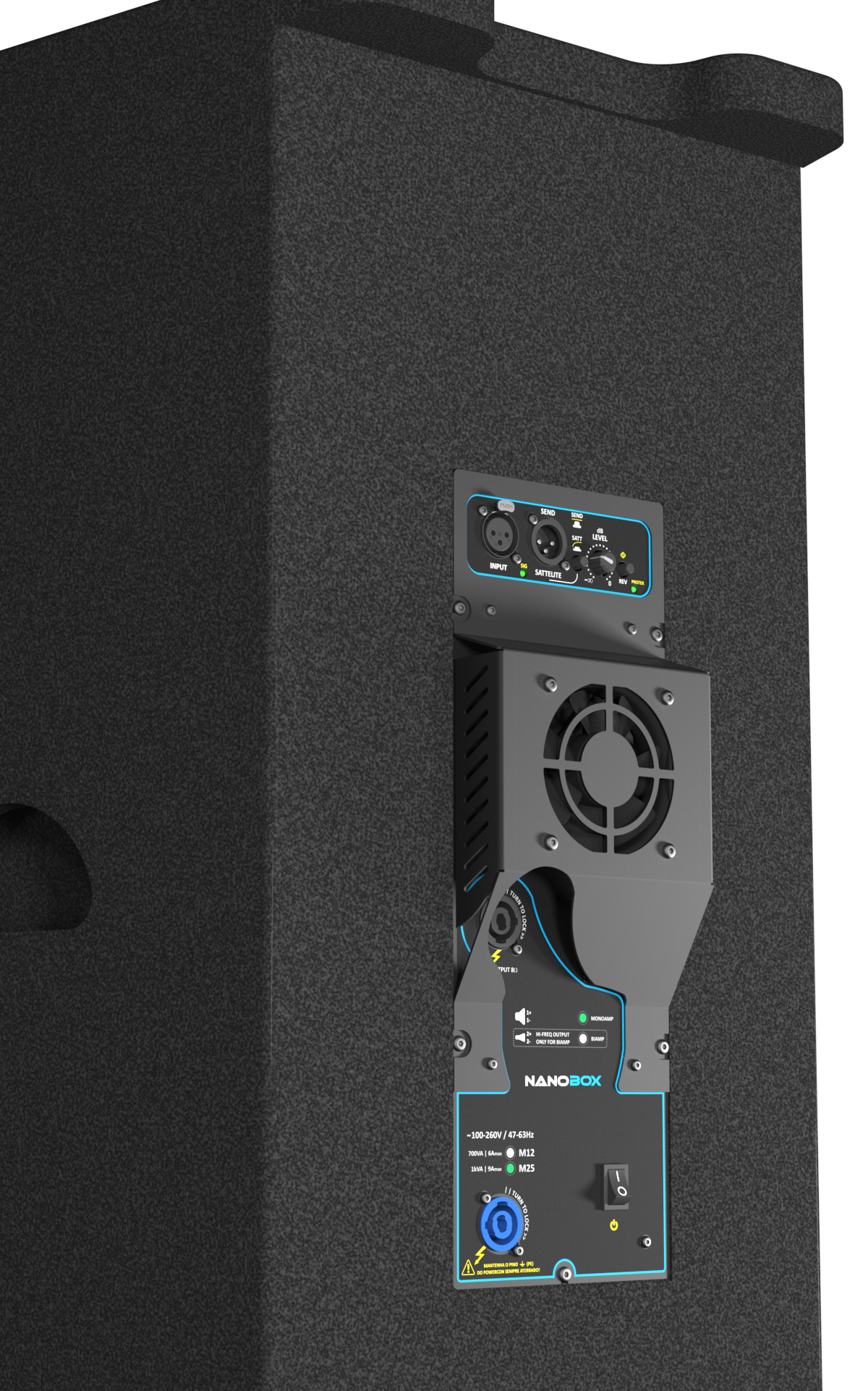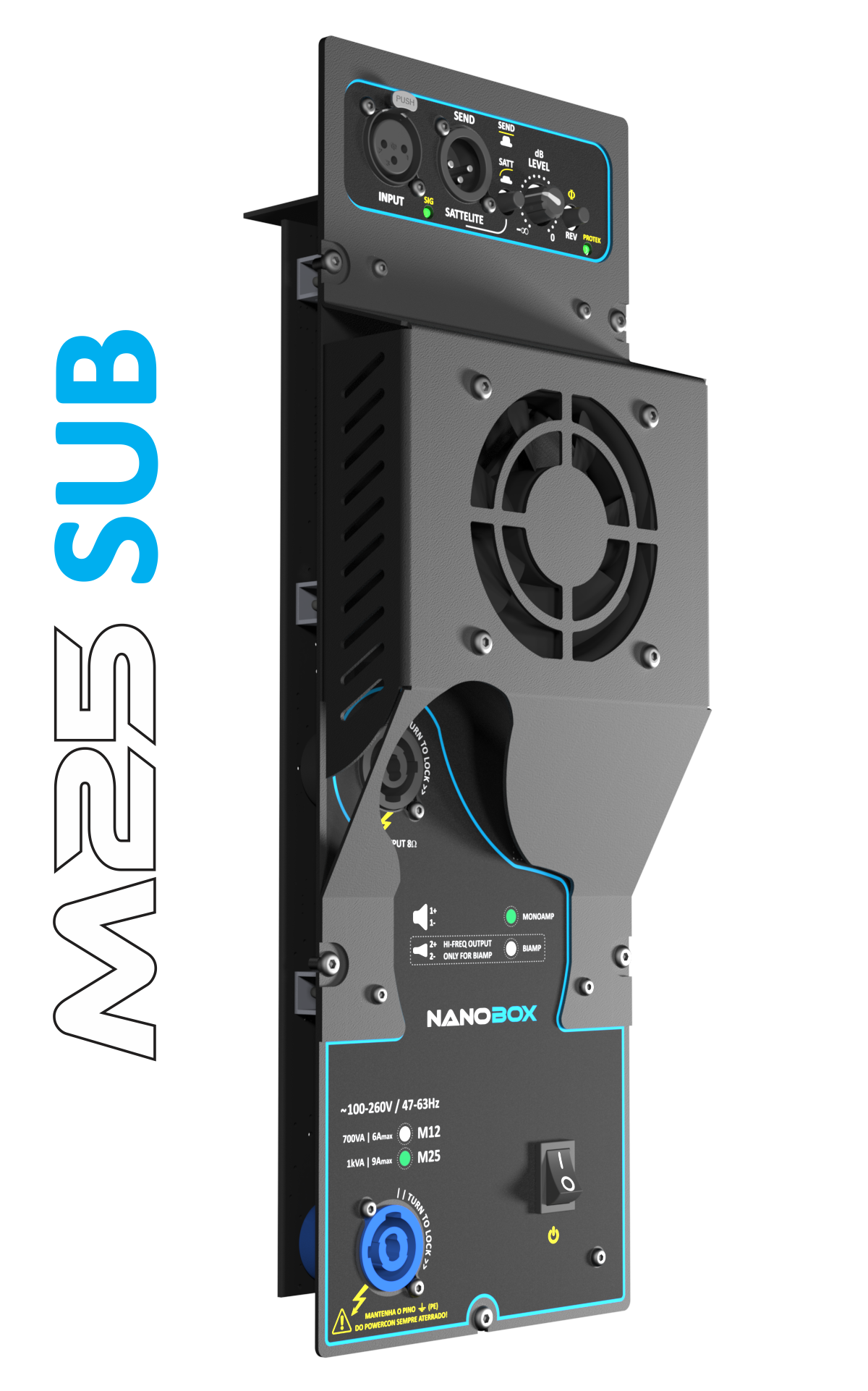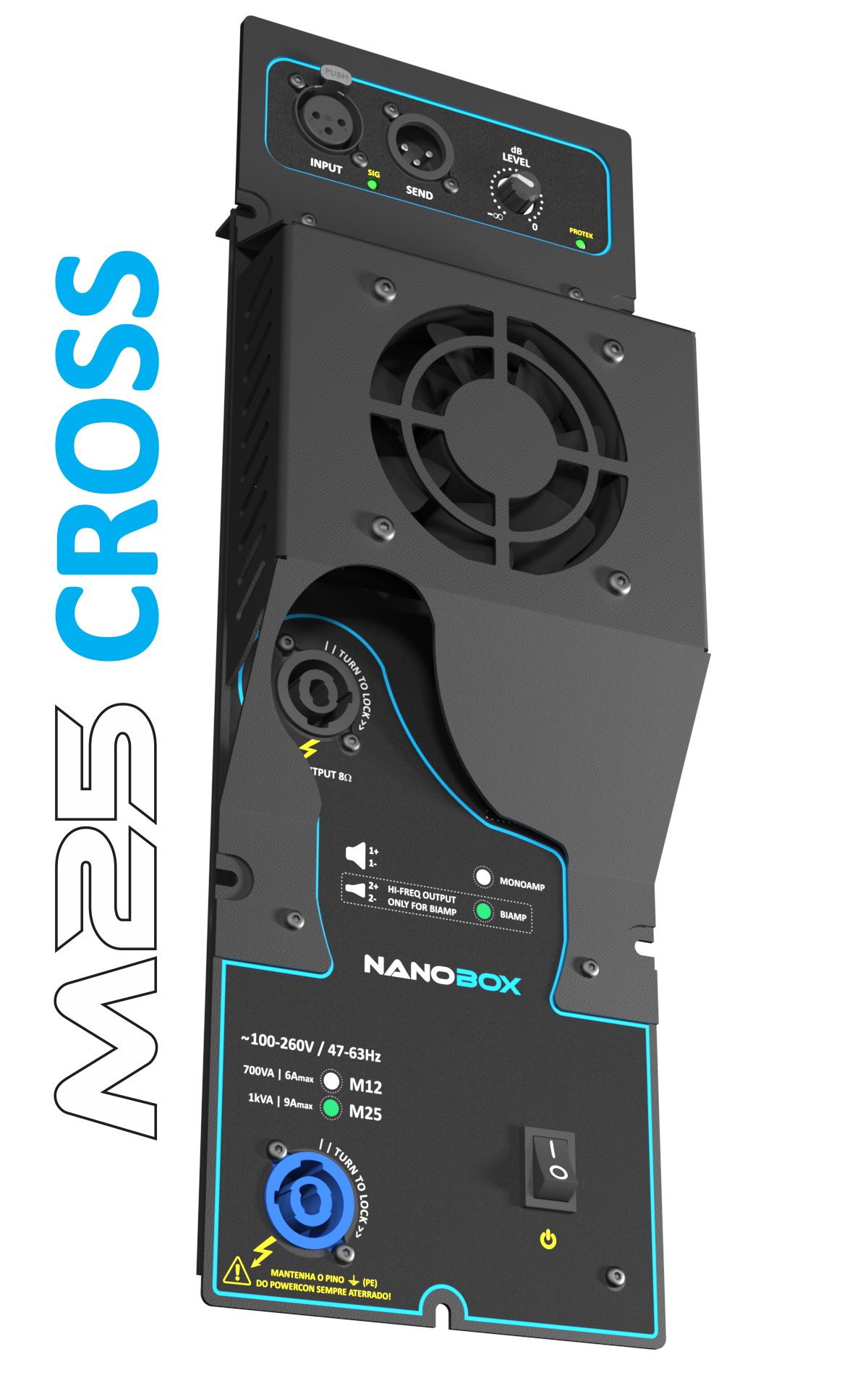 Com potência de 2500W em SUB, até 3000W em FULL & CROSS e pesando apenas 1,9kg, a família M25 é a escolha ideal para ativar caixas de grande porte. O seu inovador projeto mecânico impede a entrada de ar no circuito eletrônico, mantendo-o selado das condições do tempo e graças ao MultiFlex a sua potência pouco difere na faixa de impedâncias 4-8Ω, além de se manter idêntica em qualquer AC entre 100-260V, permanecendo operacional até 90V e, apenas neste caso com redução proporcional de potência. Equipado com PFC, exibe um consumo até 90% menor em corrente AC em relação a produtos similares, além de possibilitar até 60% a mais de potência de saída para um mesmo consumo de energia. Versátil, a família M25 é oferecida em três versões: FULL (monoamp full-range), SUB (monoamp subwoofer) e CROSS (biamp c/ crossover). As versões SUB e CROSS integram crossover Linkwitz-Riley de 24dB/8a e as versões SUB trazem uma chave de seleção para a transferência de sinal, podendo escolher entre SEND (o sinal normal), ou SATTELITE (passa-altas) para complementar de forma perfeita a resposta do SUB com caixas ativas equipadas com versões FULL ou CROSS. A série NanoBOX pode assim formar um completo sistema ativo e processado, sem qualquer equipamento adicional. Combinando amps digitais de última geração e poderosa tecnologia de fontes chaveadas ressonantes com PFC à recursos inéditos como o MultiFlex, a família M25 não possui similar no mercado.