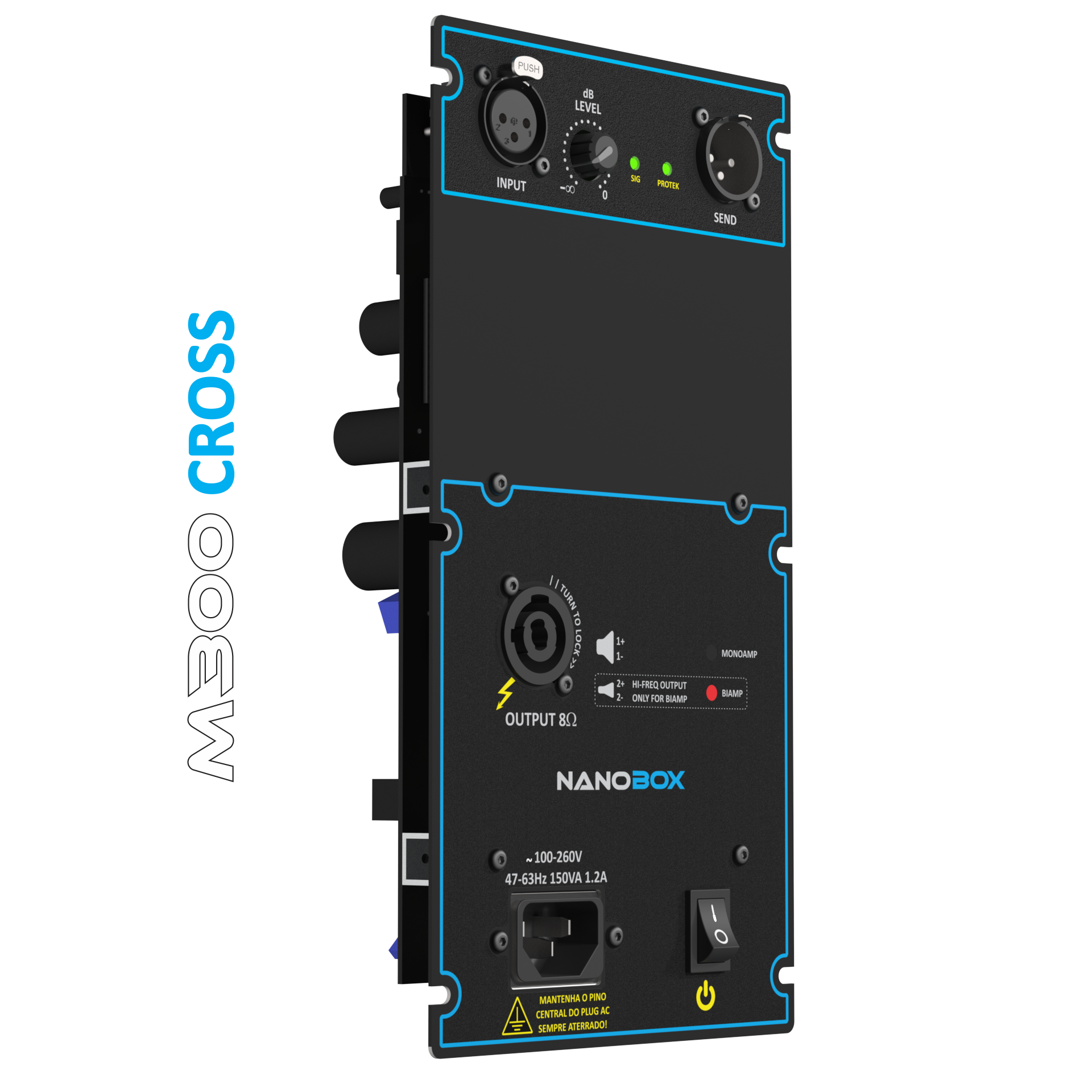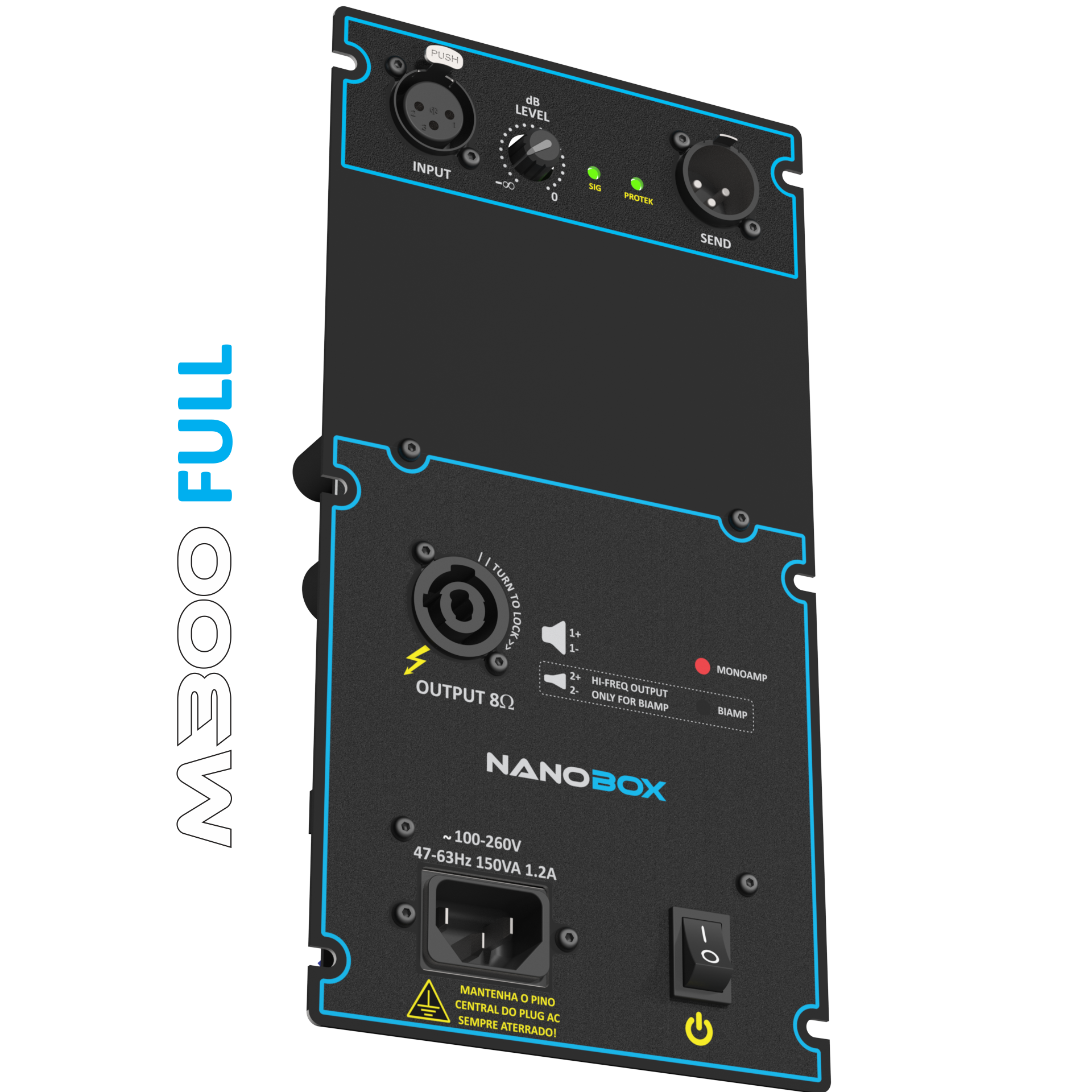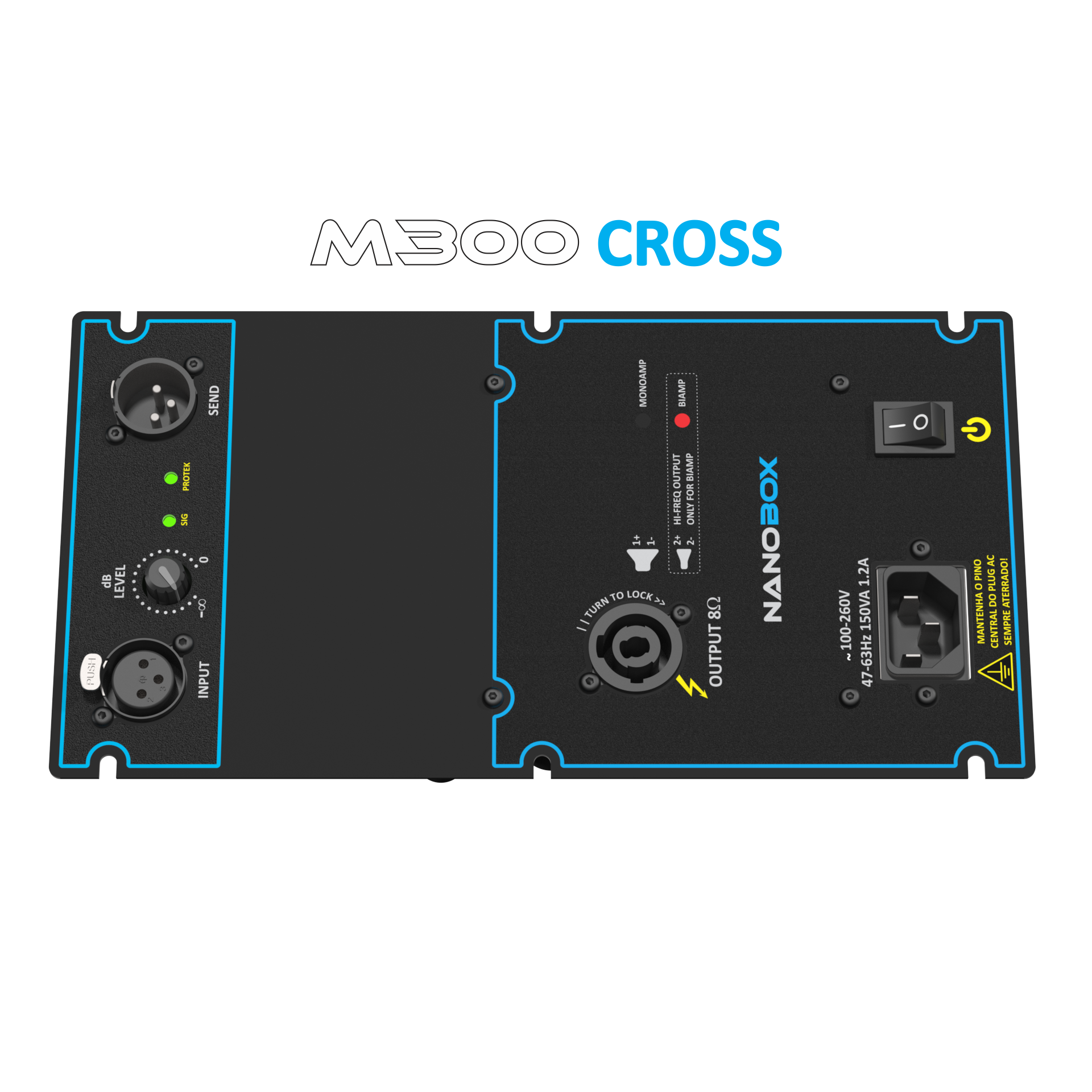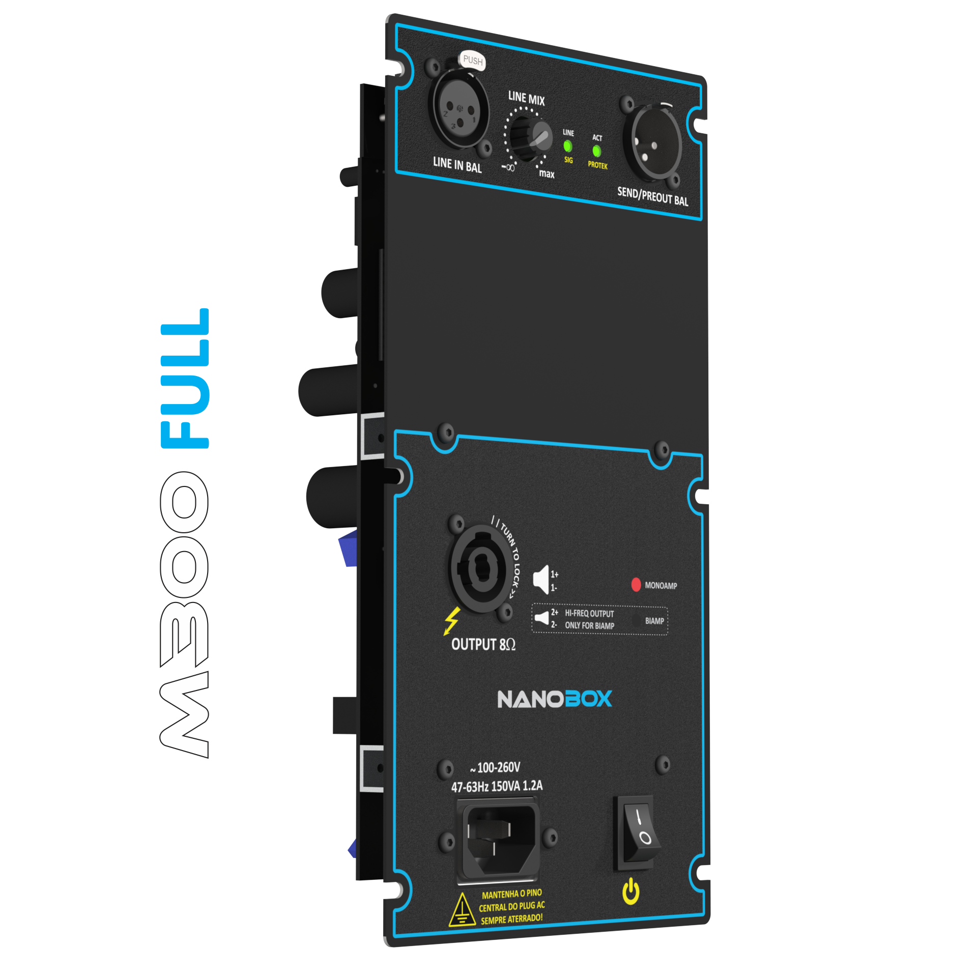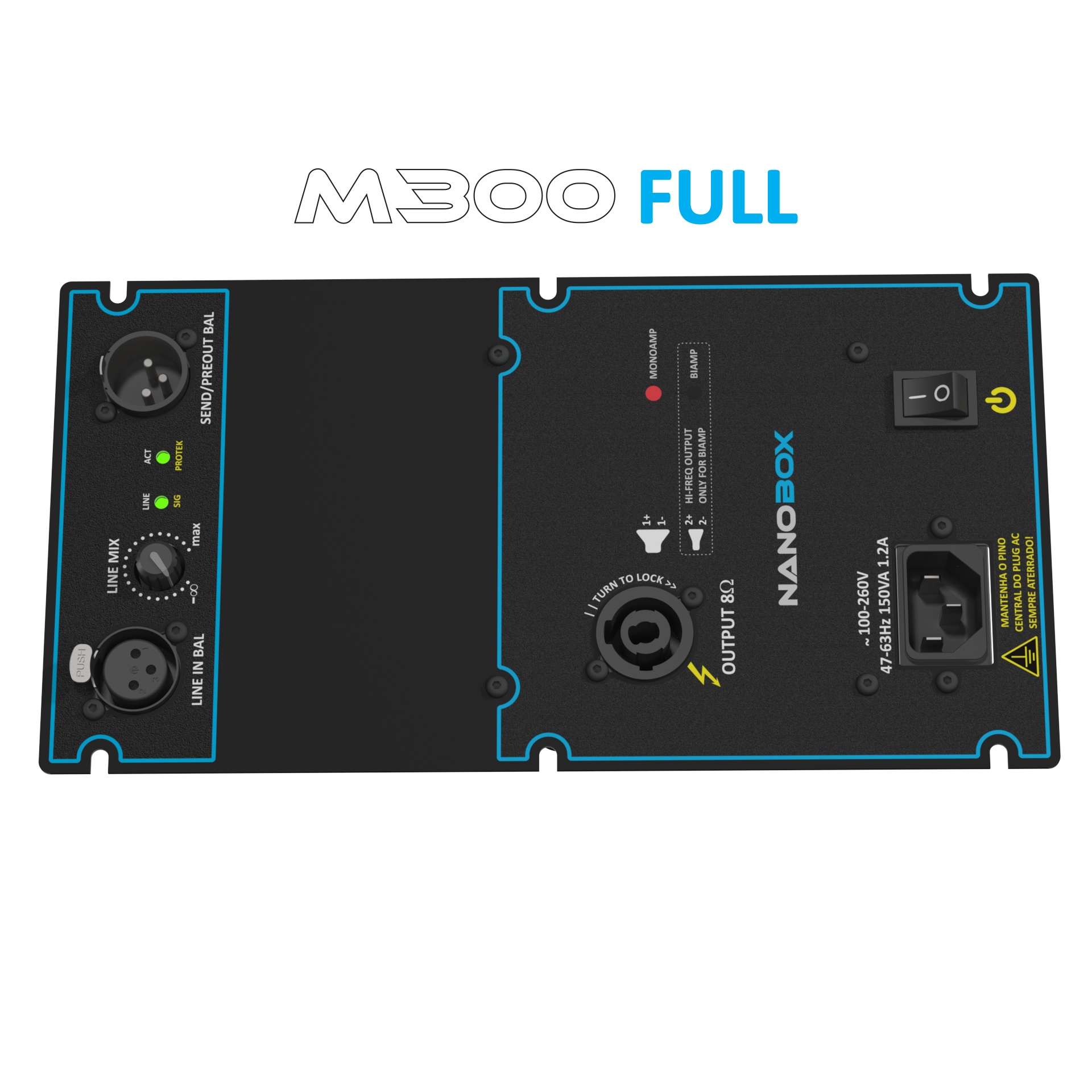 Com potência de 300W e pesando apenas 680g, a família M300 é a escolha ideal para ativar caixas de pequeno porte. Além da sua potência variar pouco na faixa 4-8Ω, ela também se mantém com qualquer AC entre 100-260V, podendo cair até 85Vac, e apenas neste caso haverá redução proporcional de potência. Seu sistema de dissipação de calor convectivo impede a entrada de ar dentro do circuito eletrônico, mantendo-o selado das condições do tempo e totalmente silencioso. Versátil, a família M300 é oferecida em quatro versões: FULL, SUB, SUB HOME (monoamp) e CROSS (biamp). As versões SUB, SUB HOME e CROSS possuem crossover Linkwitz-Riley de 12dB/8a integrado, sendo a versão SUB HOME específica para subwoofers residenciais de home-theater, com as entradas em conectores RCA não-balanceados e sem saída para caixa escrava. Combinando amps digitais de última geração e tecnologia aprimorada de fontes chaveadas ressonantes à recursos poderosos como o MultiFlex, a família M300 não possui similar no mercado.
