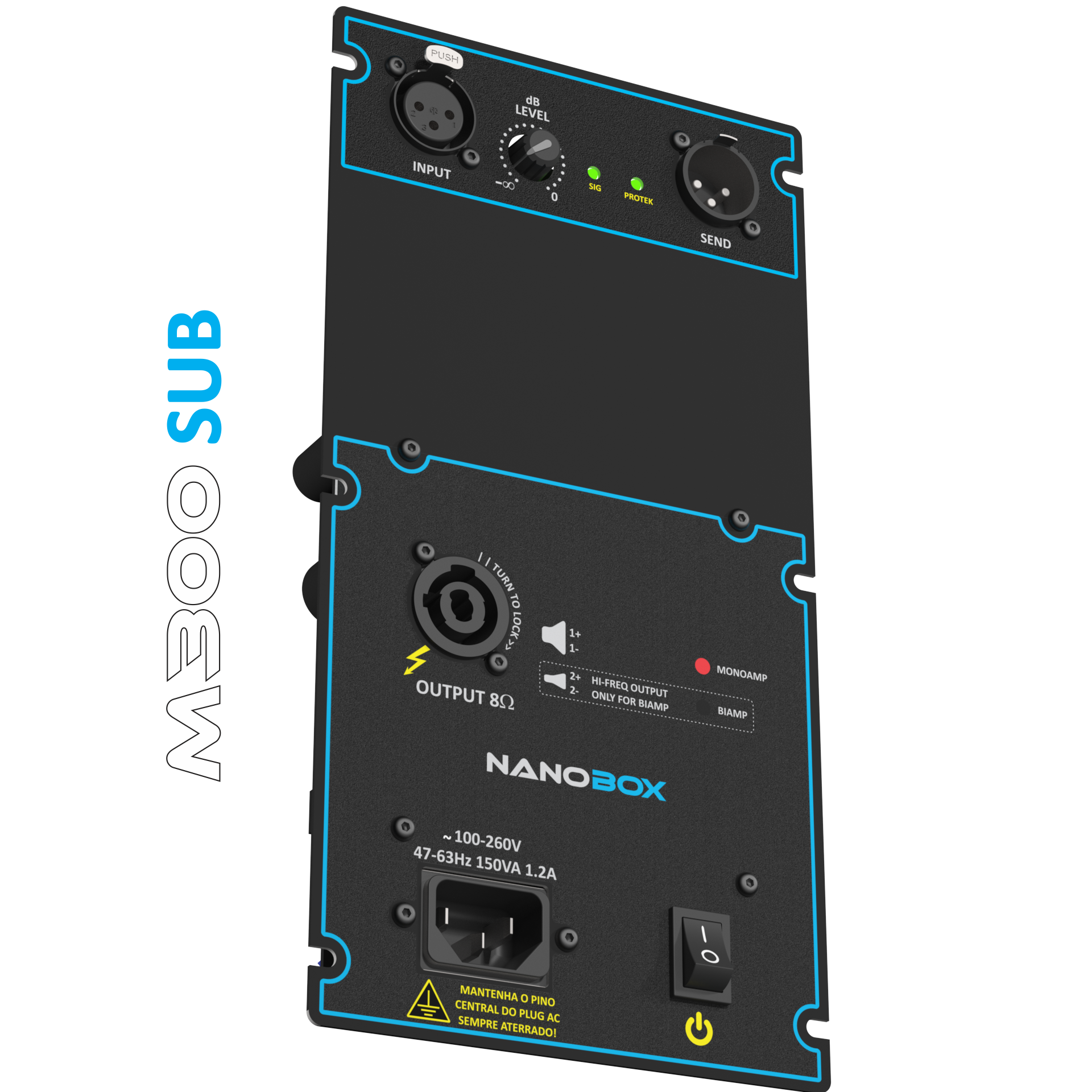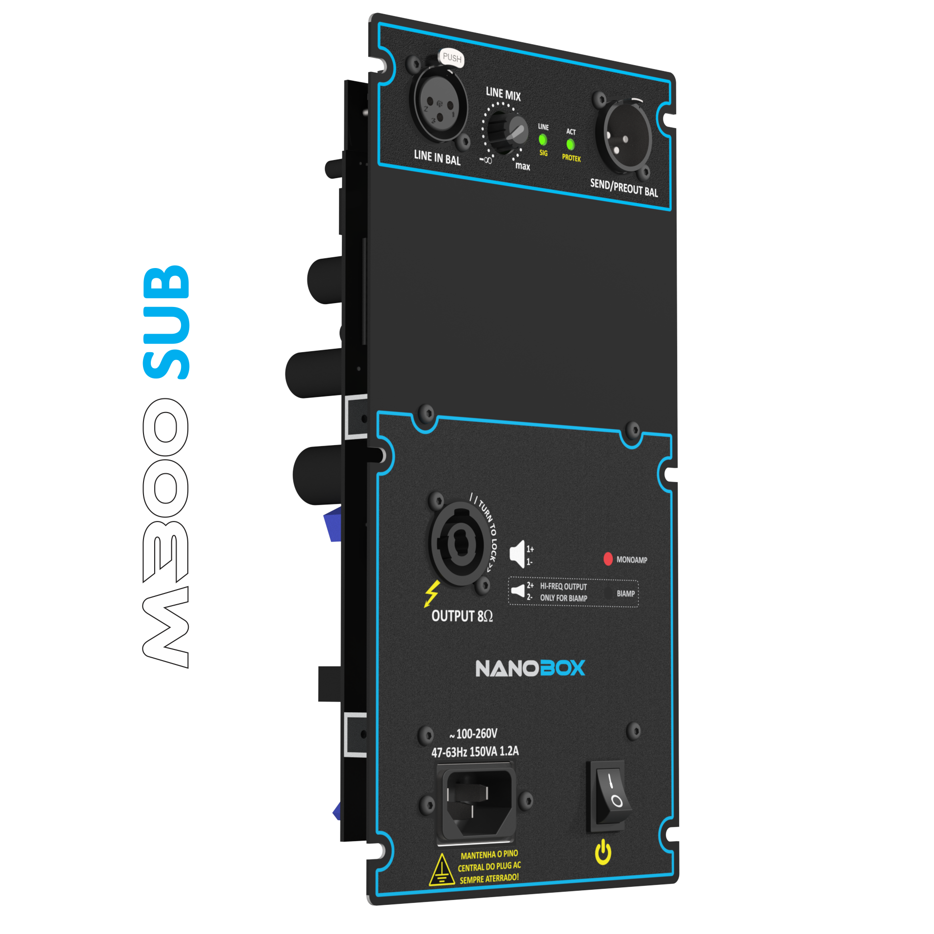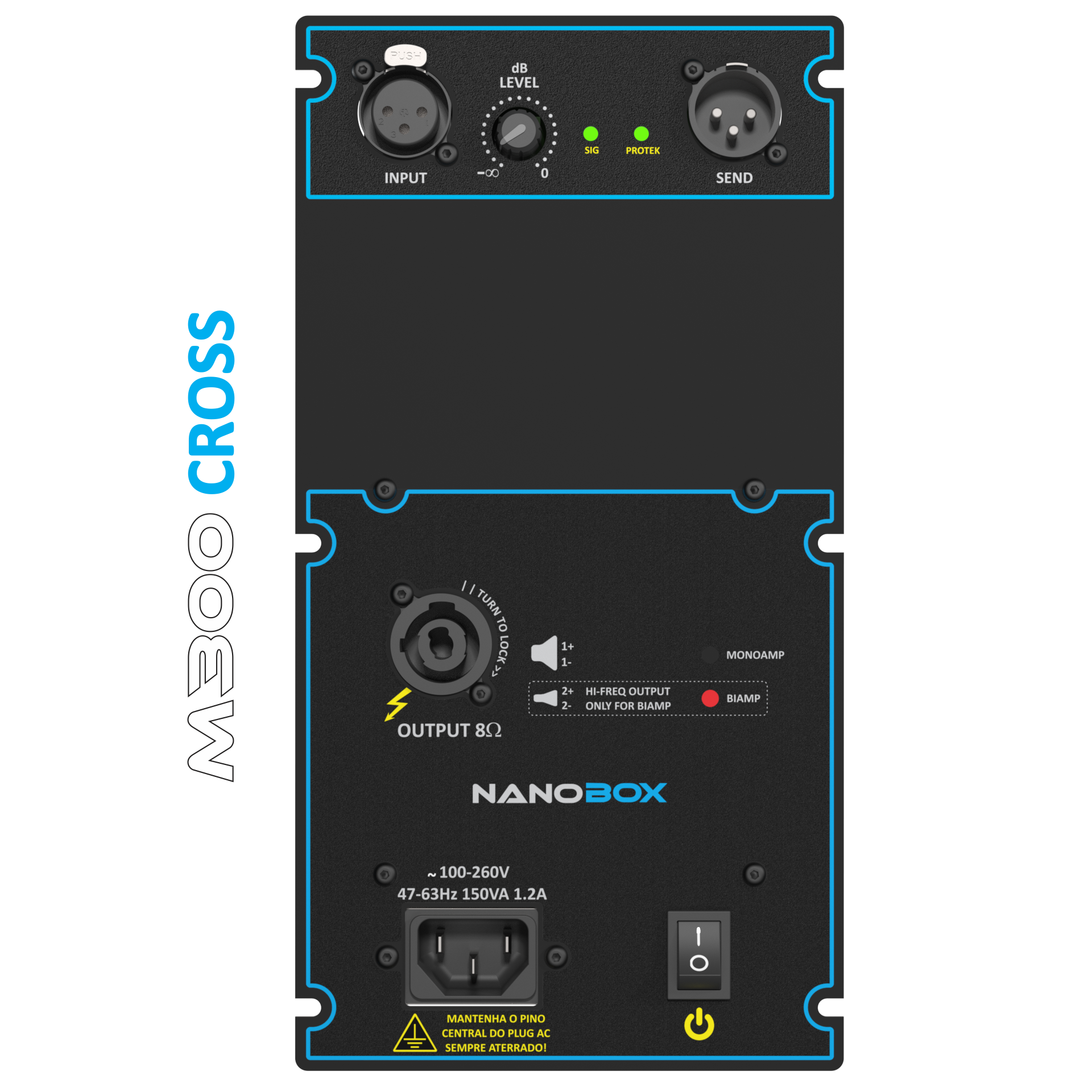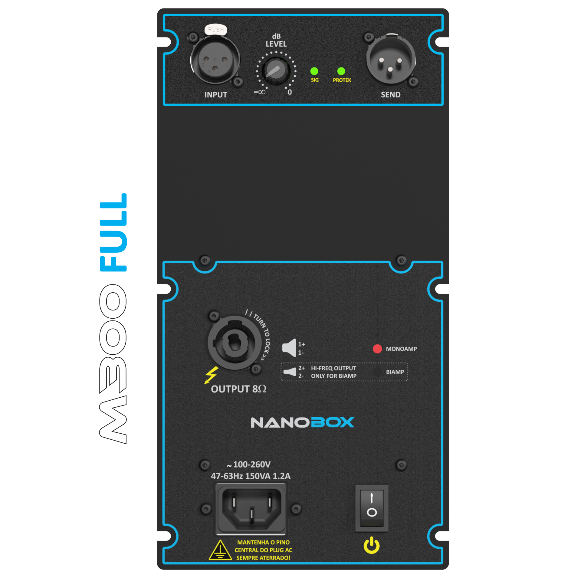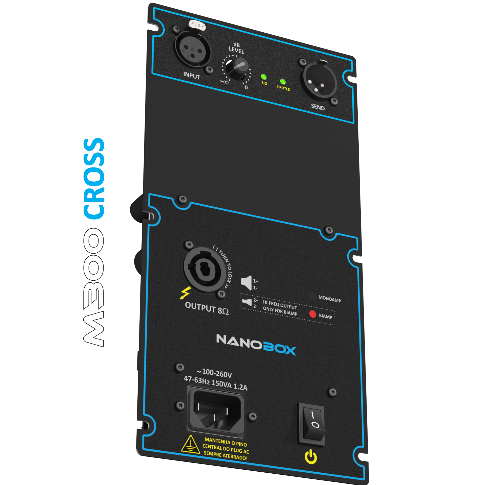 Com potência de 300W e pesando apenas 680g, a família M300 é a escolha ideal para ativar caixas de pequeno porte. Além da sua potência variar pouco na faixa 4-8Ω, ela também se mantém com qualquer AC entre 100-260V, podendo cair até 85Vac, e apenas neste caso haverá redução proporcional de potência. Seu sistema de dissipação de calor convectivo impede a entrada de ar dentro do circuito eletrônico, mantendo-o selado das condições do tempo e totalmente silencioso. Versátil, a família M300 é oferecida em quatro versões: FULL, SUB, SUB HOME (monoamp) e CROSS (biamp). As versões SUB, SUB HOME e CROSS possuem crossover Linkwitz-Riley de 12dB/8a integrado, sendo a versão SUB HOME específica para subwoofers residenciais de home-theater, com as entradas em conectores RCA não-balanceados e sem saída para caixa escrava. Combinando amps digitais de última geração e tecnologia aprimorada de fontes chaveadas ressonantes à recursos poderosos como o MultiFlex, a família M300 não possui similar no mercado.