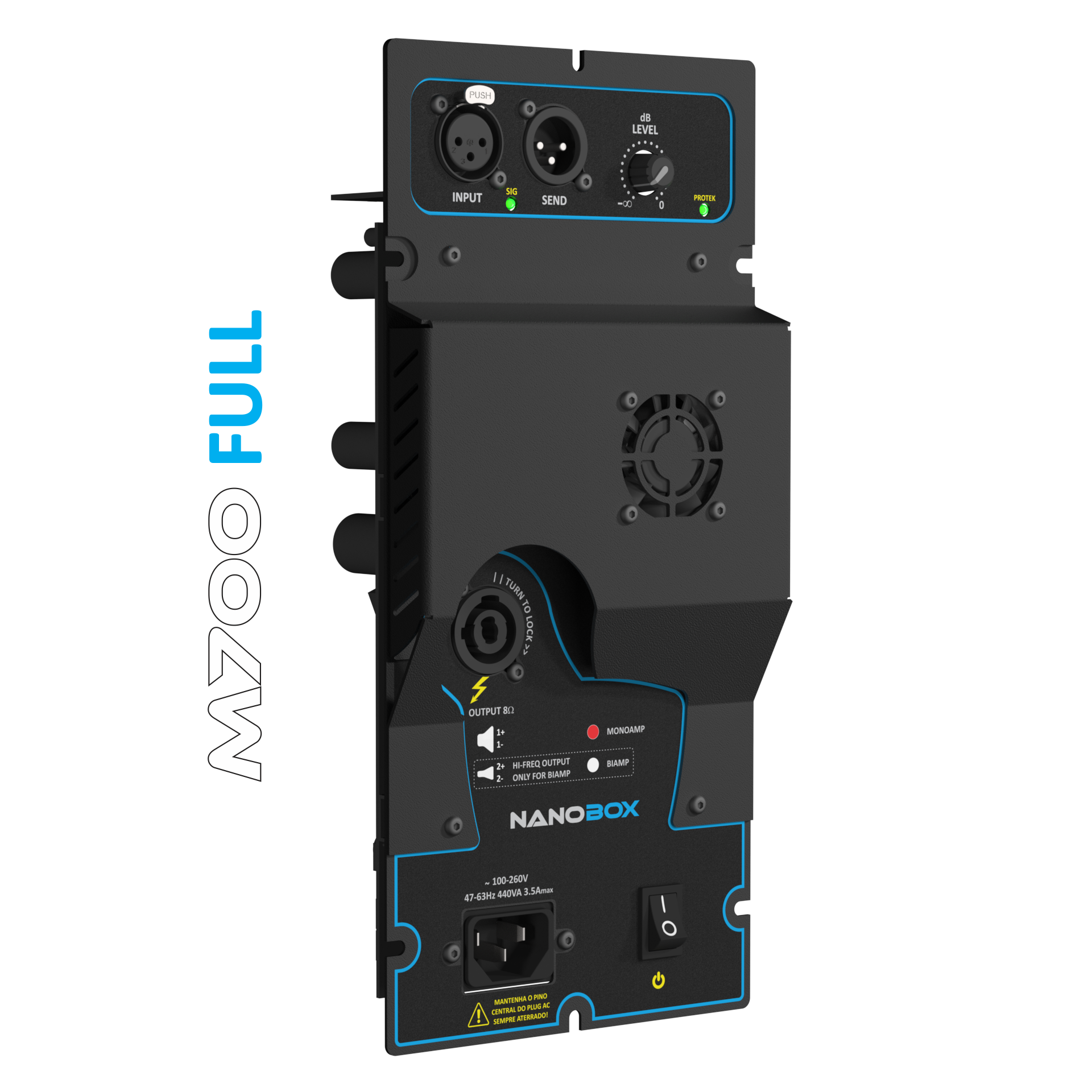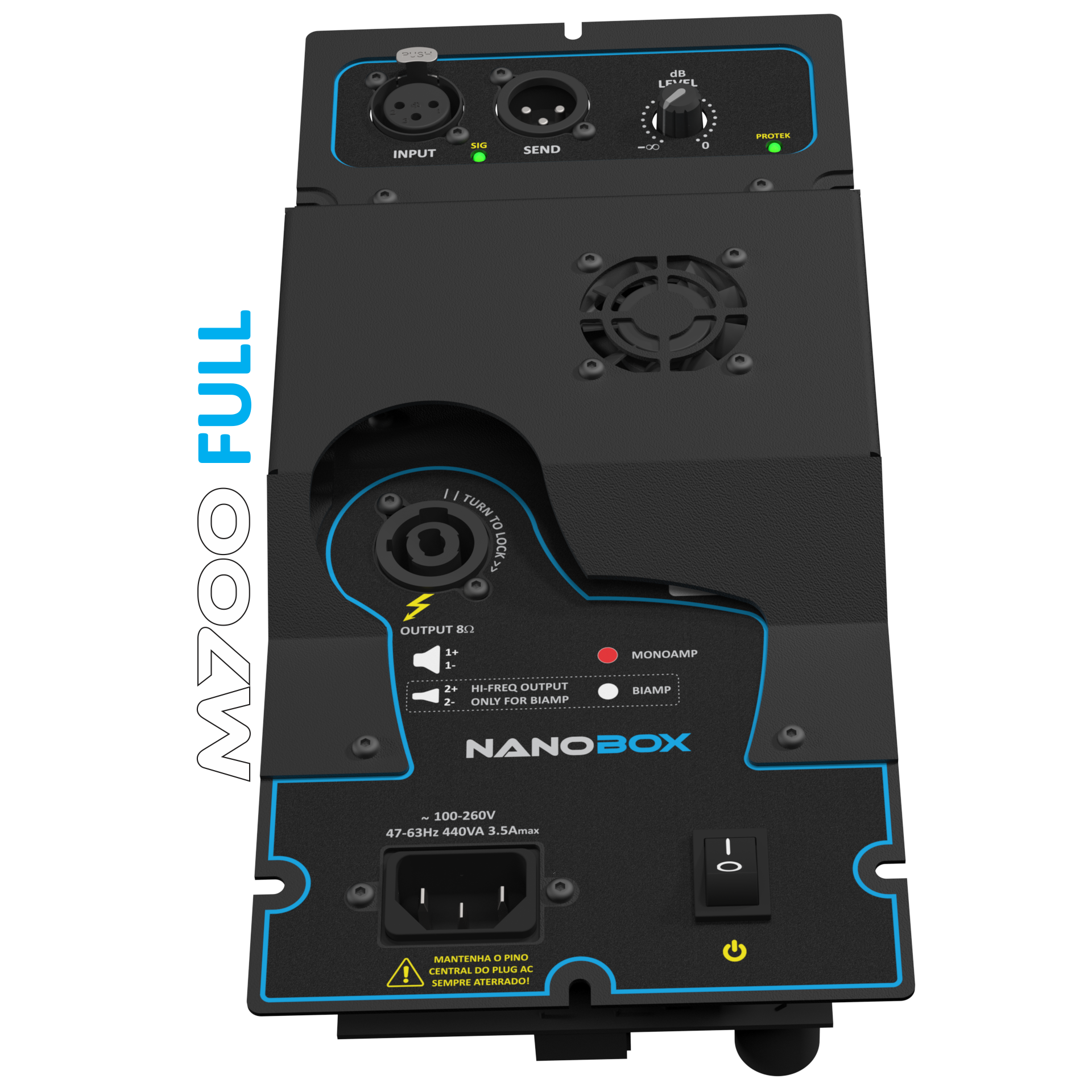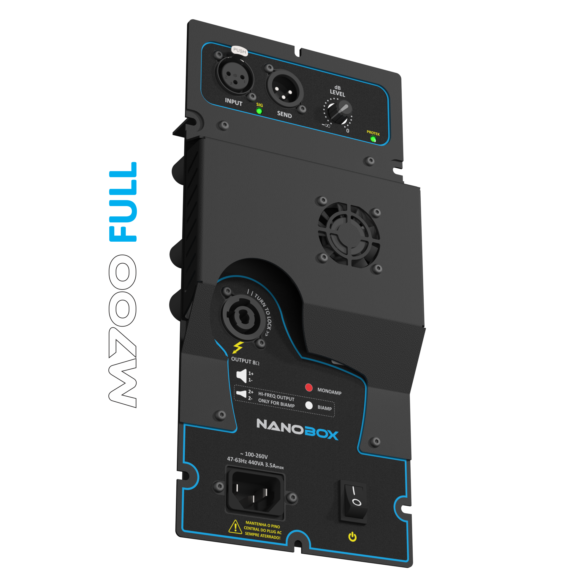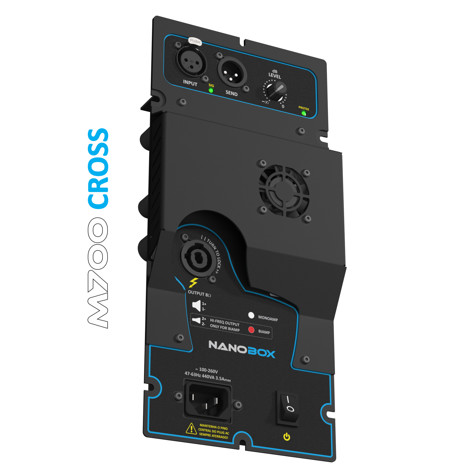 Com potência de 700W e pesando apenas 1kg a 2a geração da família M700 é a escolha ideal para ativar caixas de médio porte. A sua mecânica de 2a Geração impede a entrada de ar no circuito eletrônico, mantendo-o selado das condições do tempo e graças ao MultiFlex a sua potência pouco difere na faixa de impedâncias 4-8Ω, além de se manter idêntica em qualquer AC entre 100-260V, permanecendo operacional até 85V e, apenas neste caso com redução proporcional de potência. Versátil, a família M700 é oferecida em três versões: FULL (monoamp full-range), SUB (monoamp subwoofer) e CROSS (biamp c/ crossover). As versões SUB e CROSS integram crossover Linkwitz-Riley de 24dB/8a e as versões SUB trazem uma chave de seleção para a transferência de sinal, podendo escolher entre SEND (o sinal normal), ou SATTELITE (passa-altas) para complementar de forma perfeita a resposta do SUB com caixas ativas equipadas com versões FULL ou CROSS. A série NanoBOX pode assim formar um completo sistema ativo e processado, sem qualquer equipamento adicional. Combinando amps digitais de última geração e tecnologia aprimorada de fontes chaveadas ressonantes à recursos poderosos como o MultiFlex, a família M700 não encontra similar no mercado.