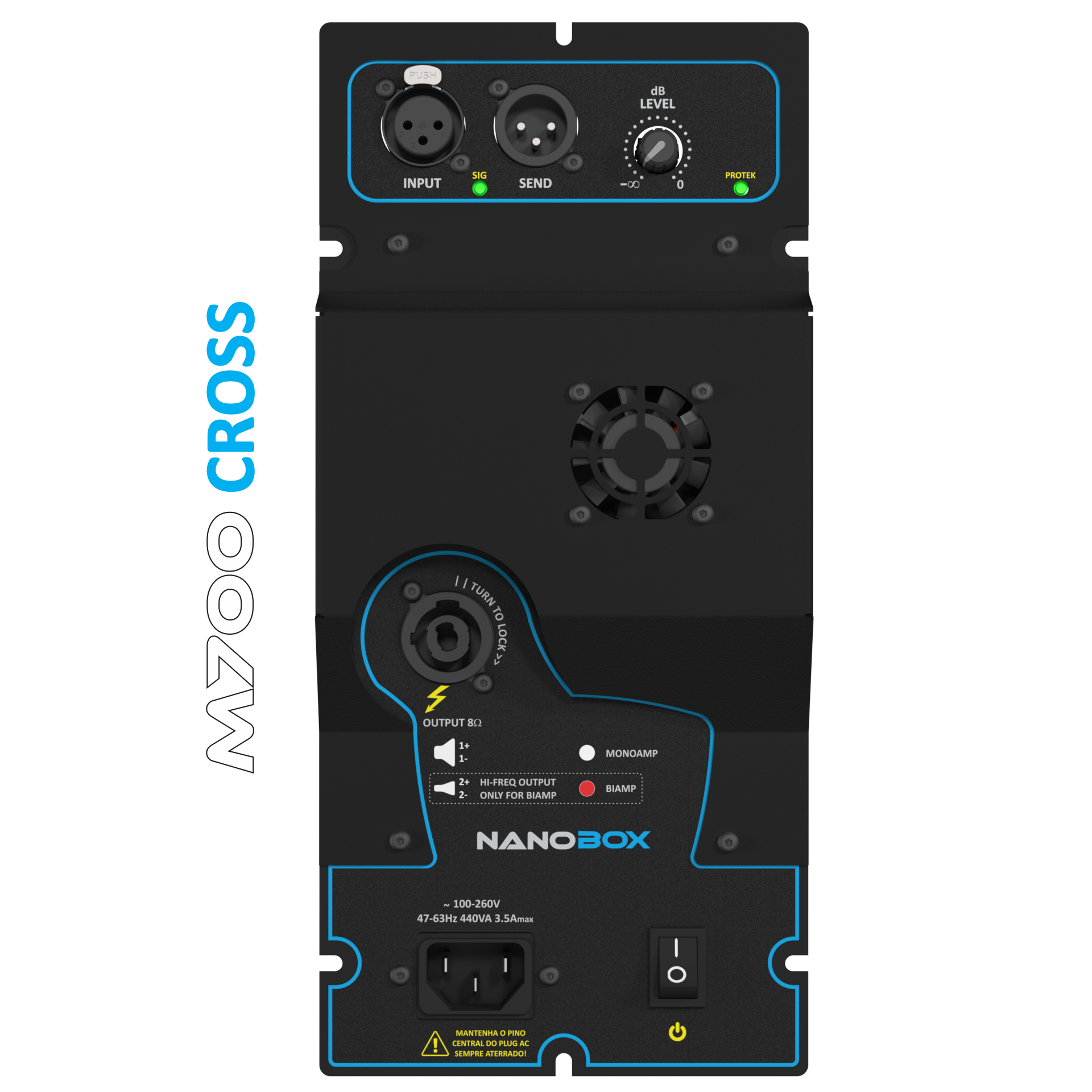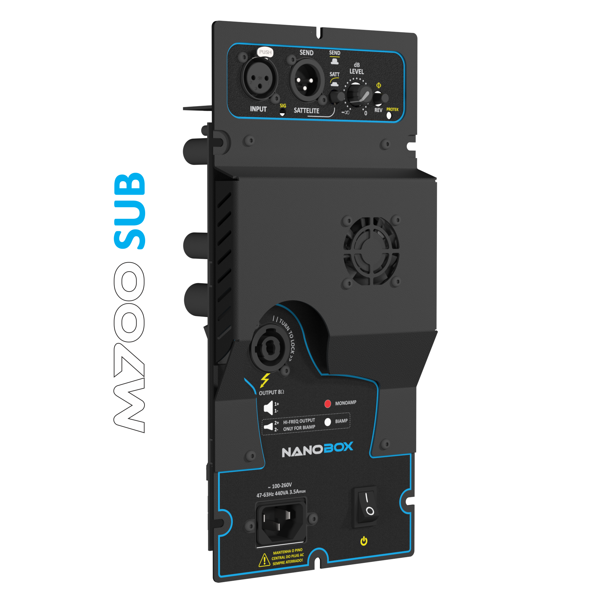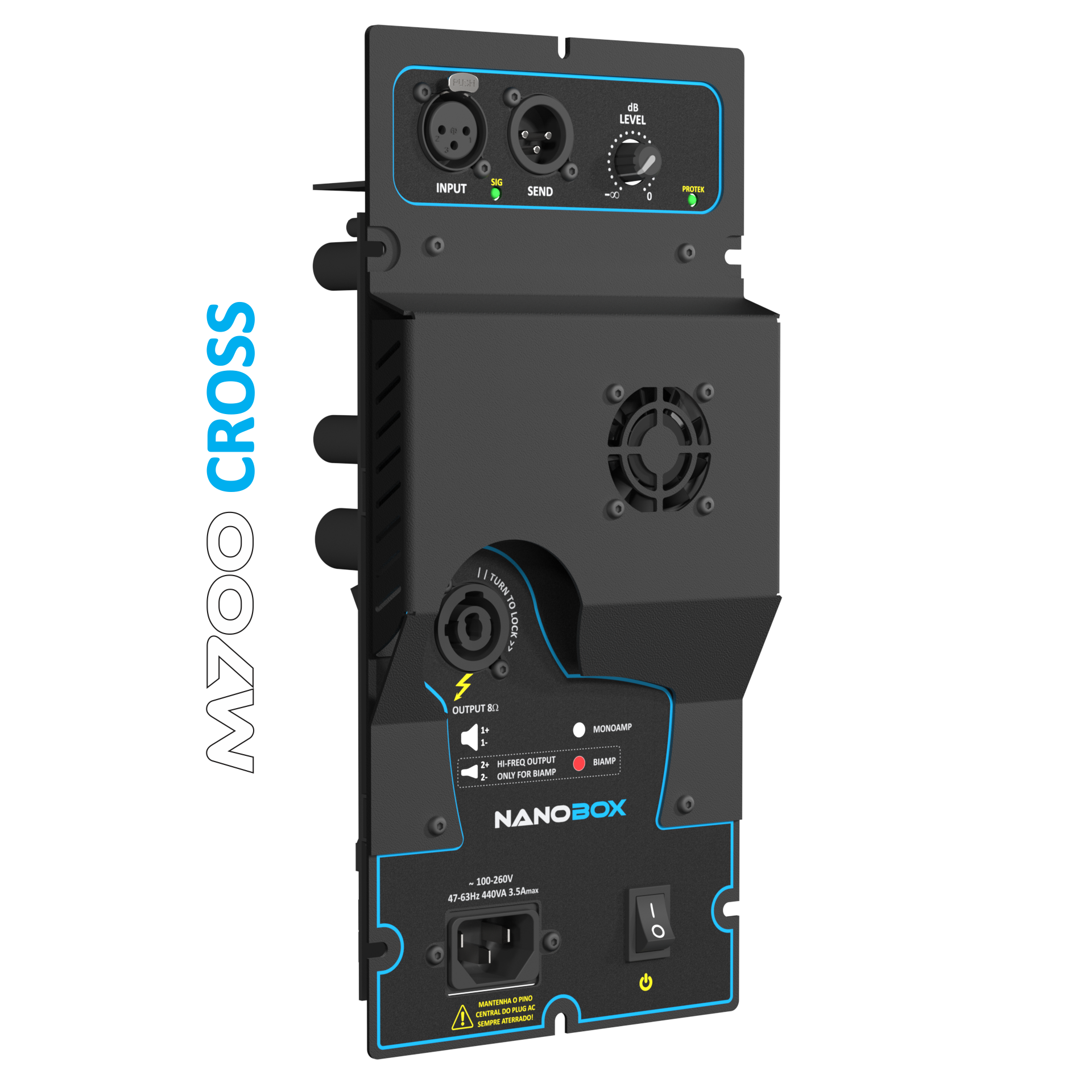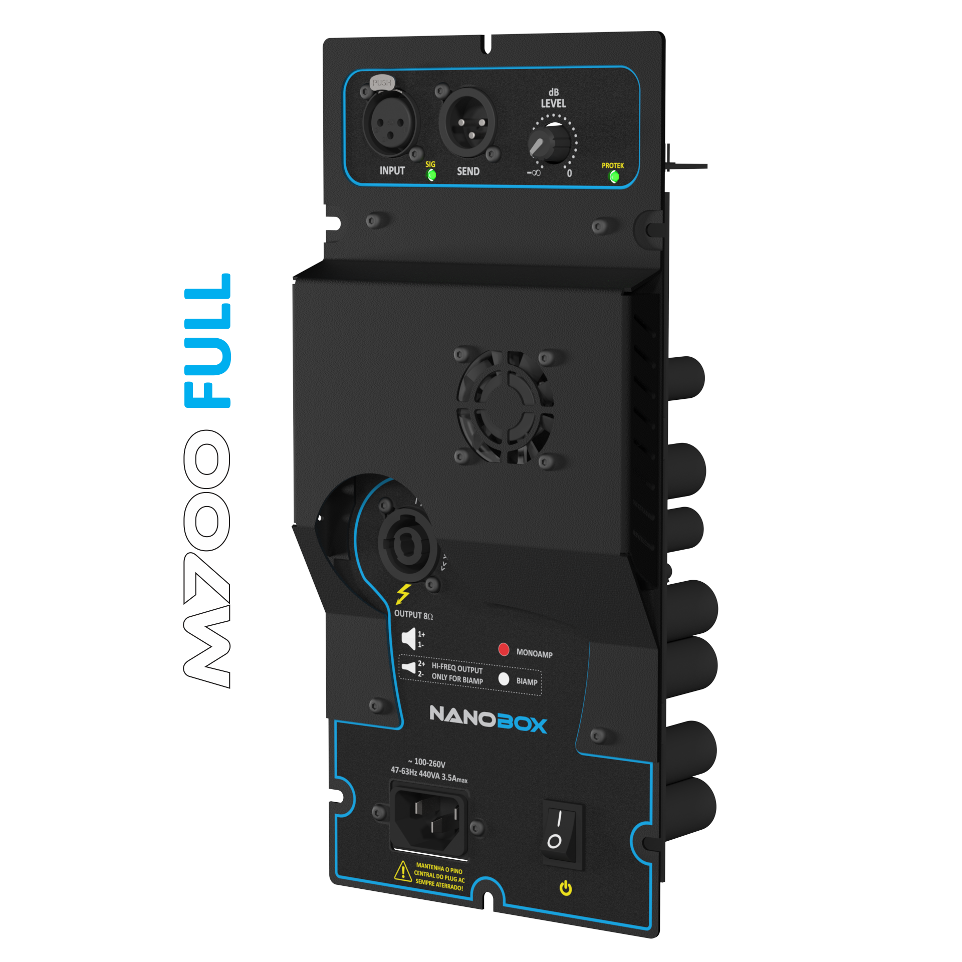 Com potência de 700W e pesando apenas 1kg a 2a geração da família M700 é a escolha ideal para ativar caixas de médio porte. A sua mecânica de 2a Geração impede a entrada de ar no circuito eletrônico, mantendo-o selado das condições do tempo e graças ao MultiFlex a sua potência pouco difere na faixa de impedâncias 4-8Ω, além de se manter idêntica em qualquer AC entre 100-260V, permanecendo operacional até 85V e, apenas neste caso com redução proporcional de potência. Versátil, a família M700 é oferecida em três versões: FULL (monoamp full-range), SUB (monoamp subwoofer) e CROSS (biamp c/ crossover). As versões SUB e CROSS integram crossover Linkwitz-Riley de 24dB/8a e as versões SUB trazem uma chave de seleção para a transferência de sinal, podendo escolher entre SEND (o sinal normal), ou SATTELITE (passa-altas) para complementar de forma perfeita a resposta do SUB com caixas ativas equipadas com versões FULL ou CROSS. A série NanoBOX pode assim formar um completo sistema ativo e processado, sem qualquer equipamento adicional. Combinando amps digitais de última geração e tecnologia aprimorada de fontes chaveadas ressonantes à recursos poderosos como o MultiFlex, a família M700 não encontra similar no mercado.