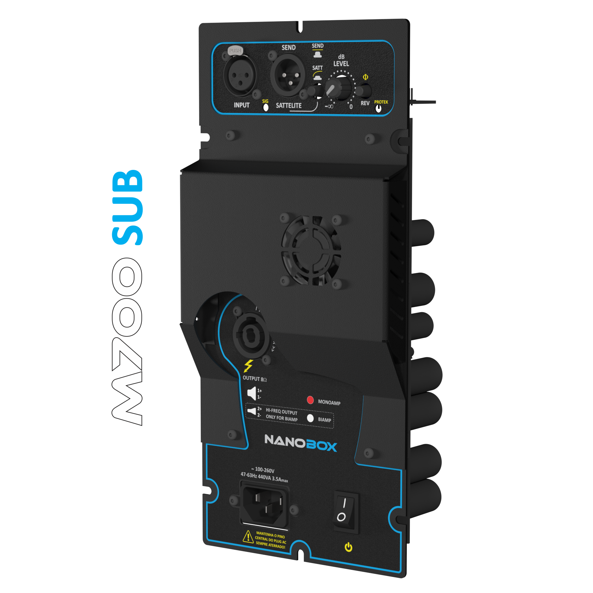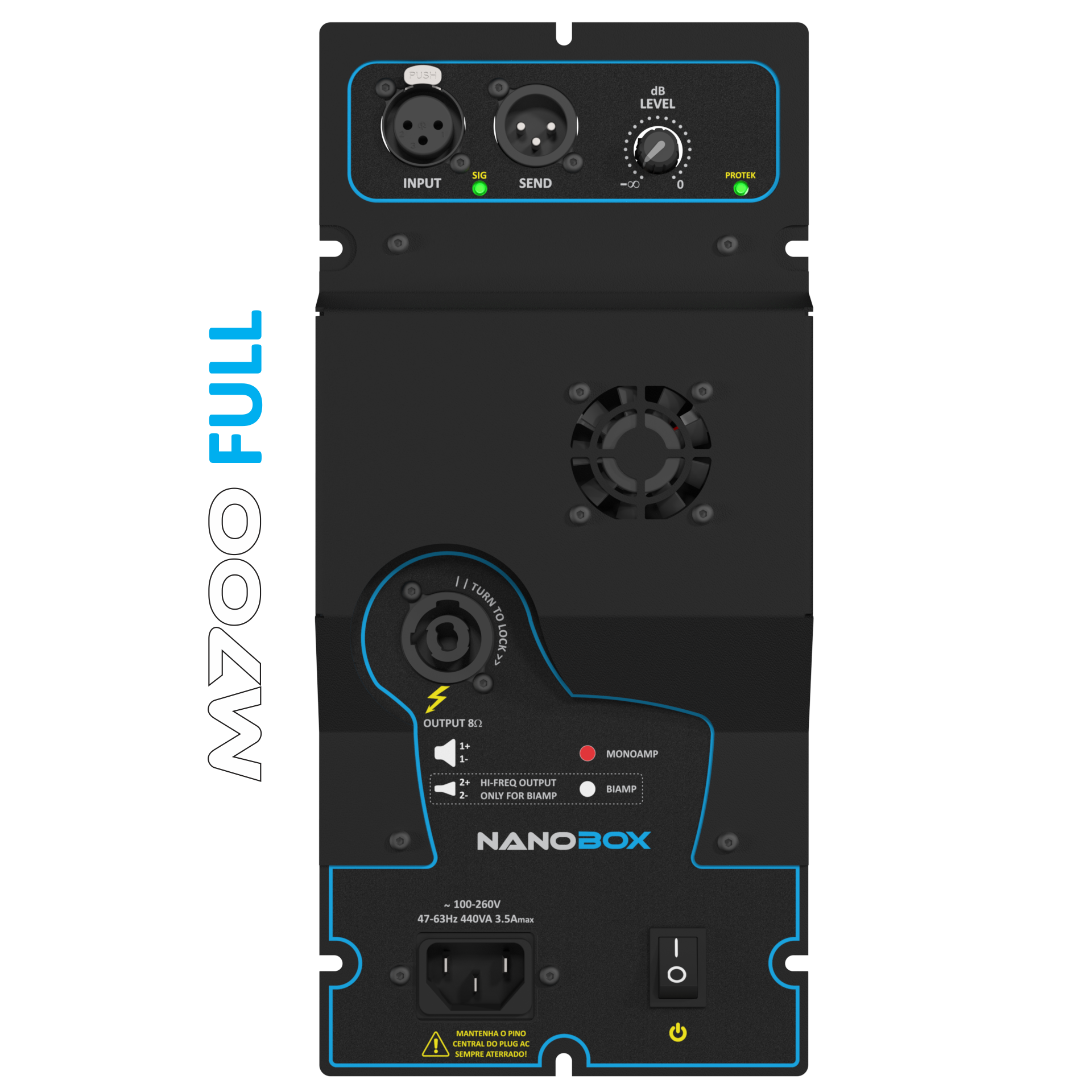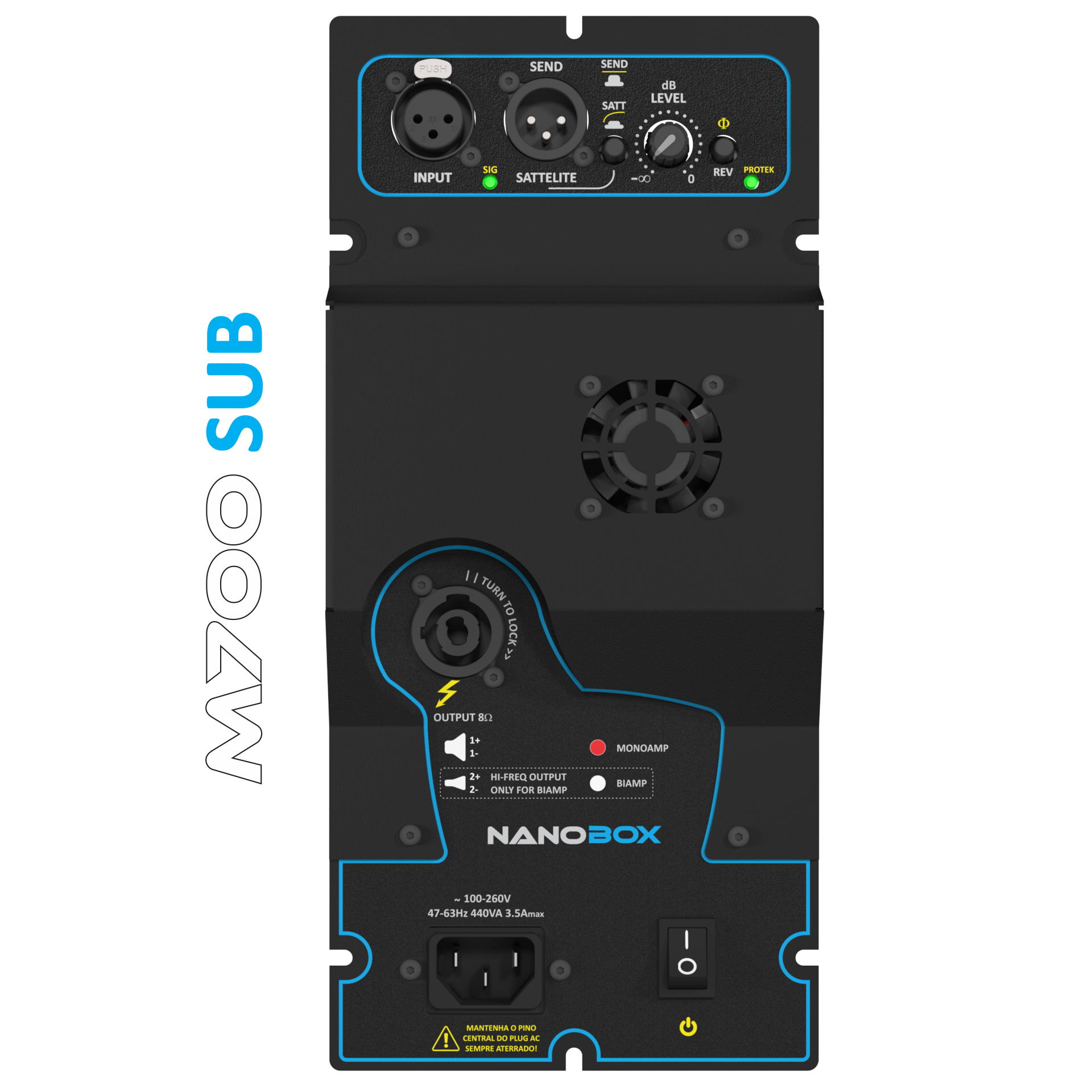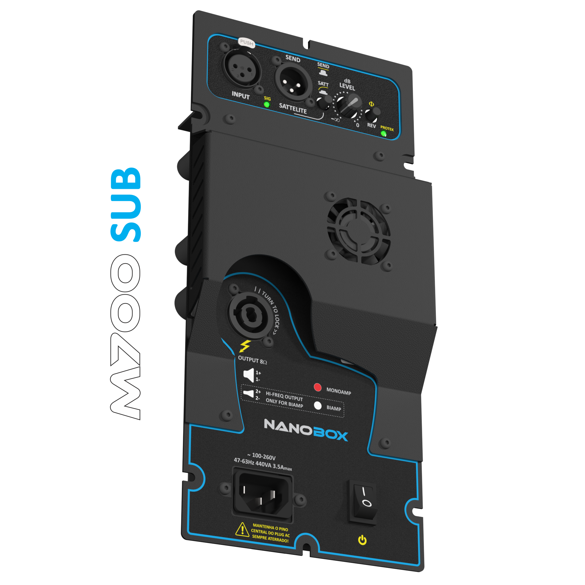 Com potência de 700W e pesando apenas 1kg a 2a geração da família M700 é a escolha ideal para ativar caixas de médio porte. A sua mecânica de 2a Geração impede a entrada de ar no circuito eletrônico, mantendo-o selado das condições do tempo e graças ao MultiFlex a sua potência pouco difere na faixa de impedâncias 4-8Ω, além de se manter idêntica em qualquer AC entre 100-260V, permanecendo operacional até 85V e, apenas neste caso com redução proporcional de potência. Versátil, a família M700 é oferecida em três versões: FULL (monoamp full-range), SUB (monoamp subwoofer) e CROSS (biamp c/ crossover). As versões SUB e CROSS integram crossover Linkwitz-Riley de 24dB/8a e as versões SUB trazem uma chave de seleção para a transferência de sinal, podendo escolher entre SEND (o sinal normal), ou SATTELITE (passa-altas) para complementar de forma perfeita a resposta do SUB com caixas ativas equipadas com versões FULL ou CROSS. A série NanoBOX pode assim formar um completo sistema ativo e processado, sem qualquer equipamento adicional. Combinando amps digitais de última geração e tecnologia aprimorada de fontes chaveadas ressonantes à recursos poderosos como o MultiFlex, a família M700 não encontra similar no mercado.