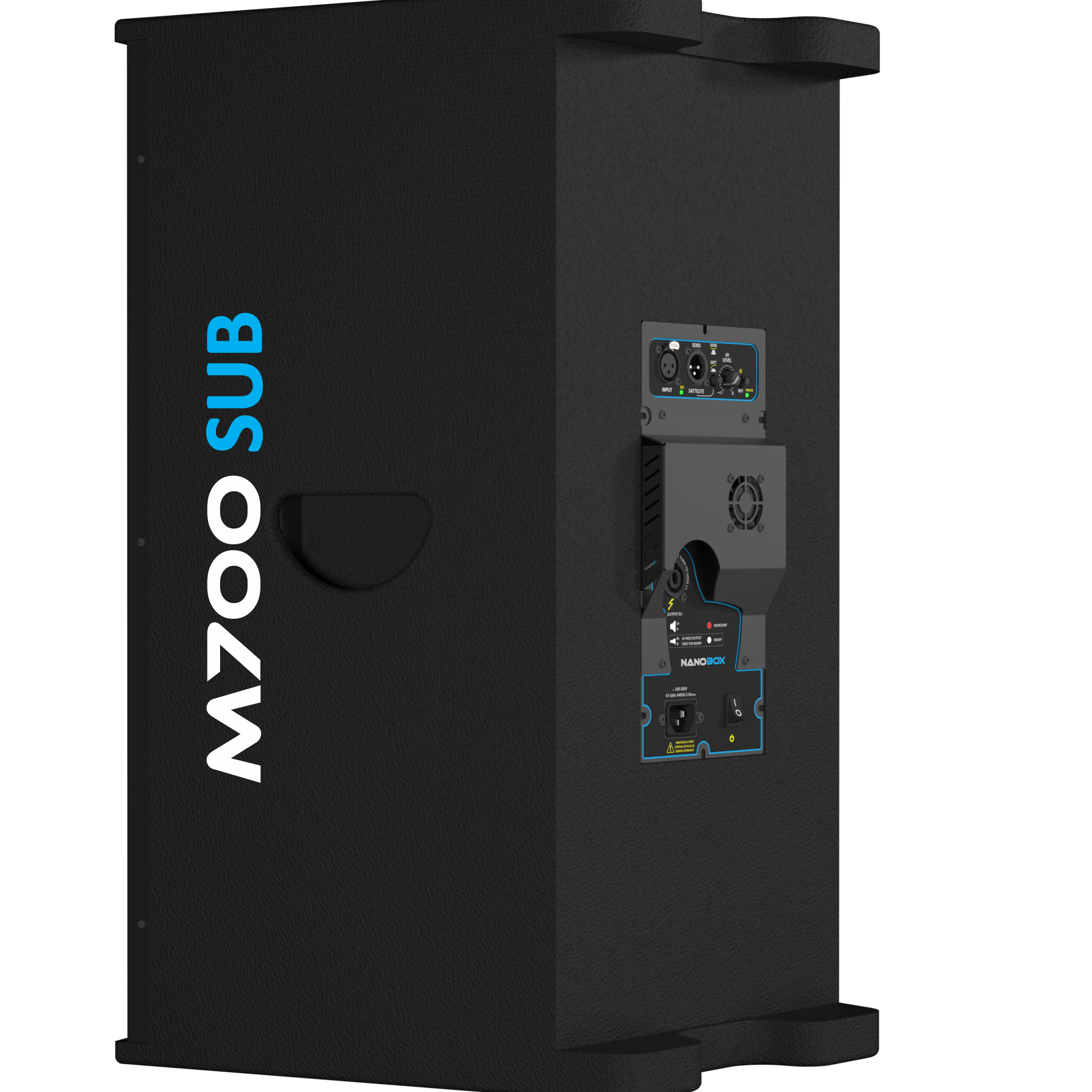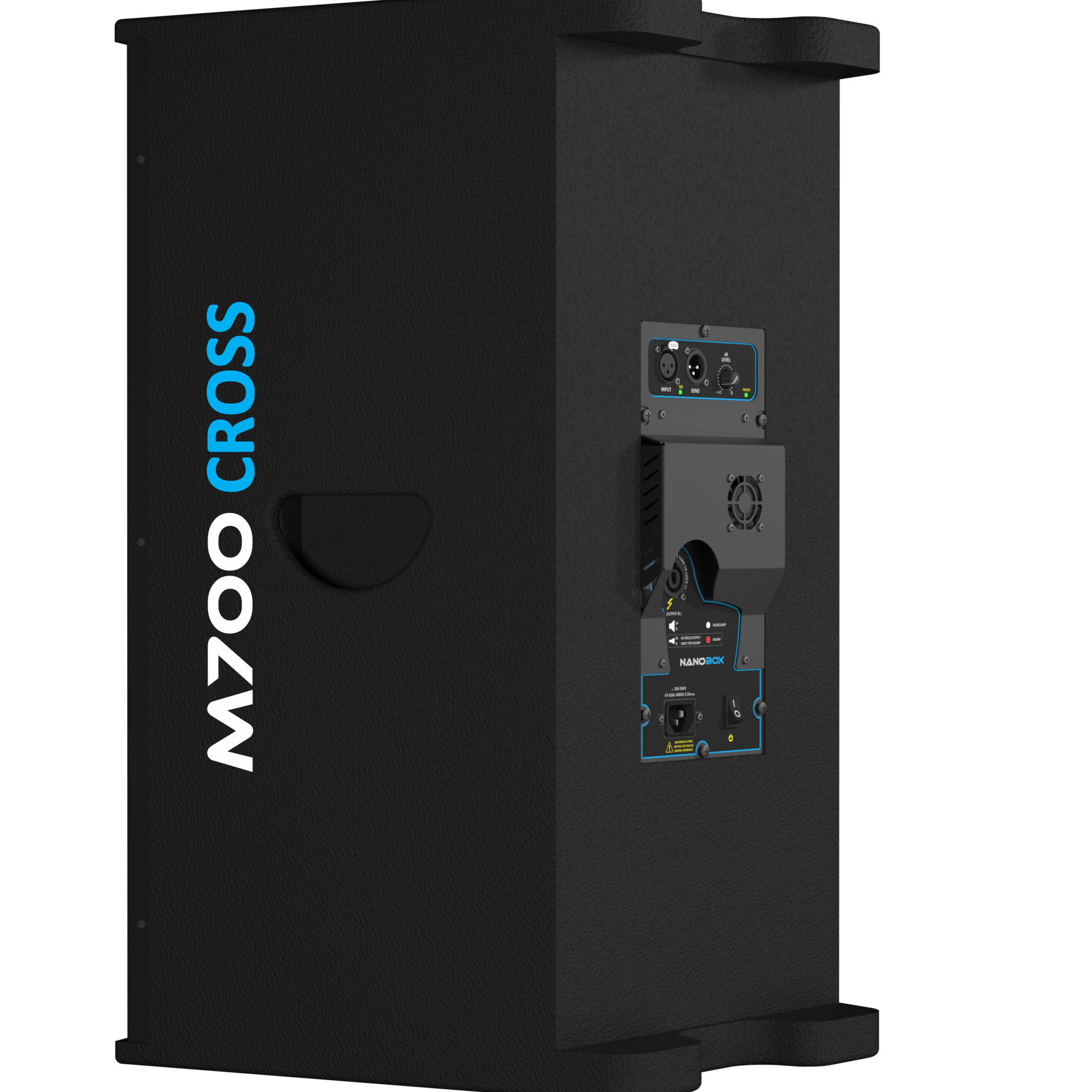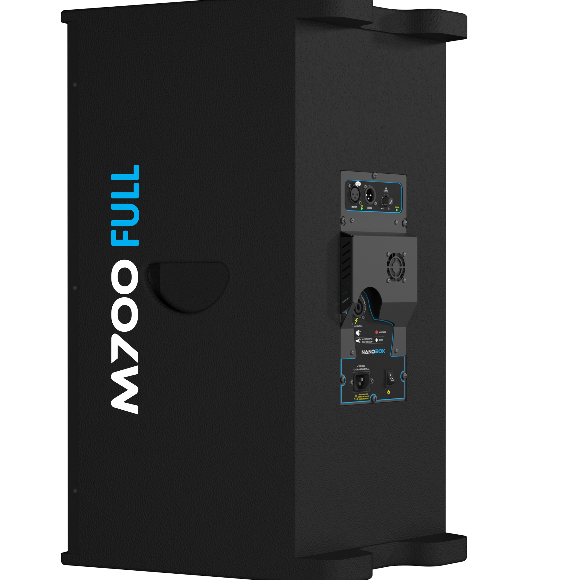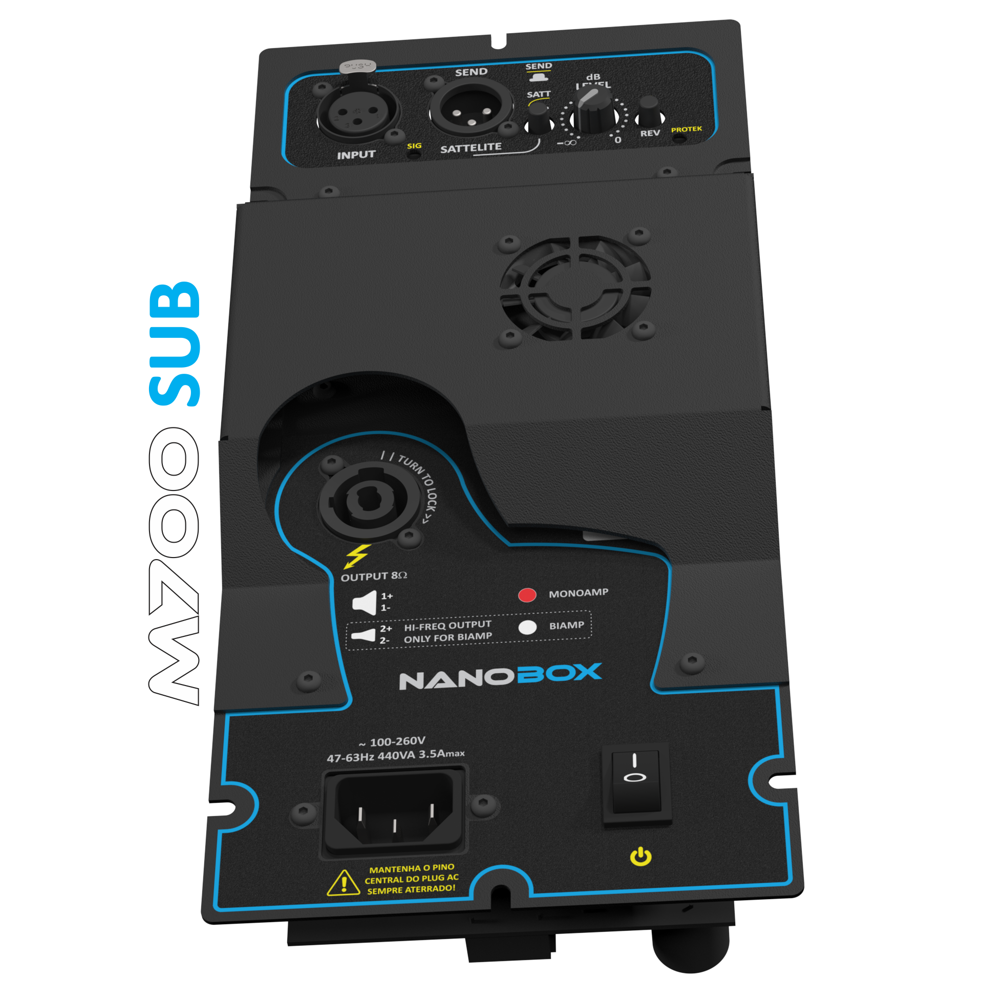 Com potência de 700W e pesando apenas 1kg a 2a geração da família M700 é a escolha ideal para ativar caixas de médio porte. A sua mecânica de 2a Geração impede a entrada de ar no circuito eletrônico, mantendo-o selado das condições do tempo e graças ao MultiFlex a sua potência pouco difere na faixa de impedâncias 4-8Ω, além de se manter idêntica em qualquer AC entre 100-260V, permanecendo operacional até 85V e, apenas neste caso com redução proporcional de potência. Versátil, a família M700 é oferecida em três versões: FULL (monoamp full-range), SUB (monoamp subwoofer) e CROSS (biamp c/ crossover). As versões SUB e CROSS integram crossover Linkwitz-Riley de 24dB/8a e as versões SUB trazem uma chave de seleção para a transferência de sinal, podendo escolher entre SEND (o sinal normal), ou SATTELITE (passa-altas) para complementar de forma perfeita a resposta do SUB com caixas ativas equipadas com versões FULL ou CROSS. A série NanoBOX pode assim formar um completo sistema ativo e processado, sem qualquer equipamento adicional. Combinando amps digitais de última geração e tecnologia aprimorada de fontes chaveadas ressonantes à recursos poderosos como o MultiFlex, a família M700 não encontra similar no mercado.